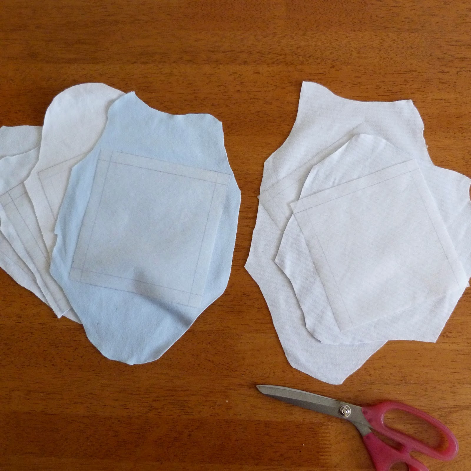 2) Measure your fabric pieces to work out the largest size square you can cut from them. We managed to get 6″ squares. Cut six 6″ squares (or your required size) from your Vilene and mark 1/2″ seam allowance guides on all edges with a pencil on the side that ISN’T iron-on (as shown in the picture below). Iron these Vilene squares onto the reverse of your vest or fabric pieces. We have placed some diagonally because we wanted the stripes on the finished cube to be diagonal.