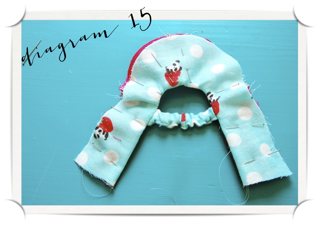 14. Pull open the un-sewn straight edges, and line up against each other right sides facing – outer fabric to outer fabric, lining fabric to lining fabric, making sure to line up the centre seam. Sew down this line (diagram 15a). Turn the right way out again, finger pressing the seam.