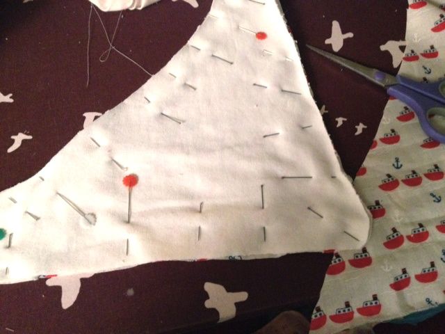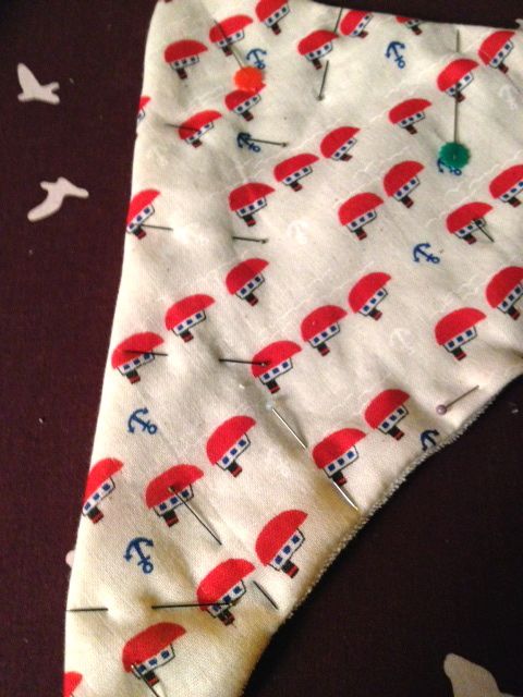 1. Using the template – cut out 1 triangle of patterned fabric and one of terry, and lay them right sides facing each other. Pin all around. It’s a good idea to over pin when using stretch fabrics, or fabrics with a loose weave.