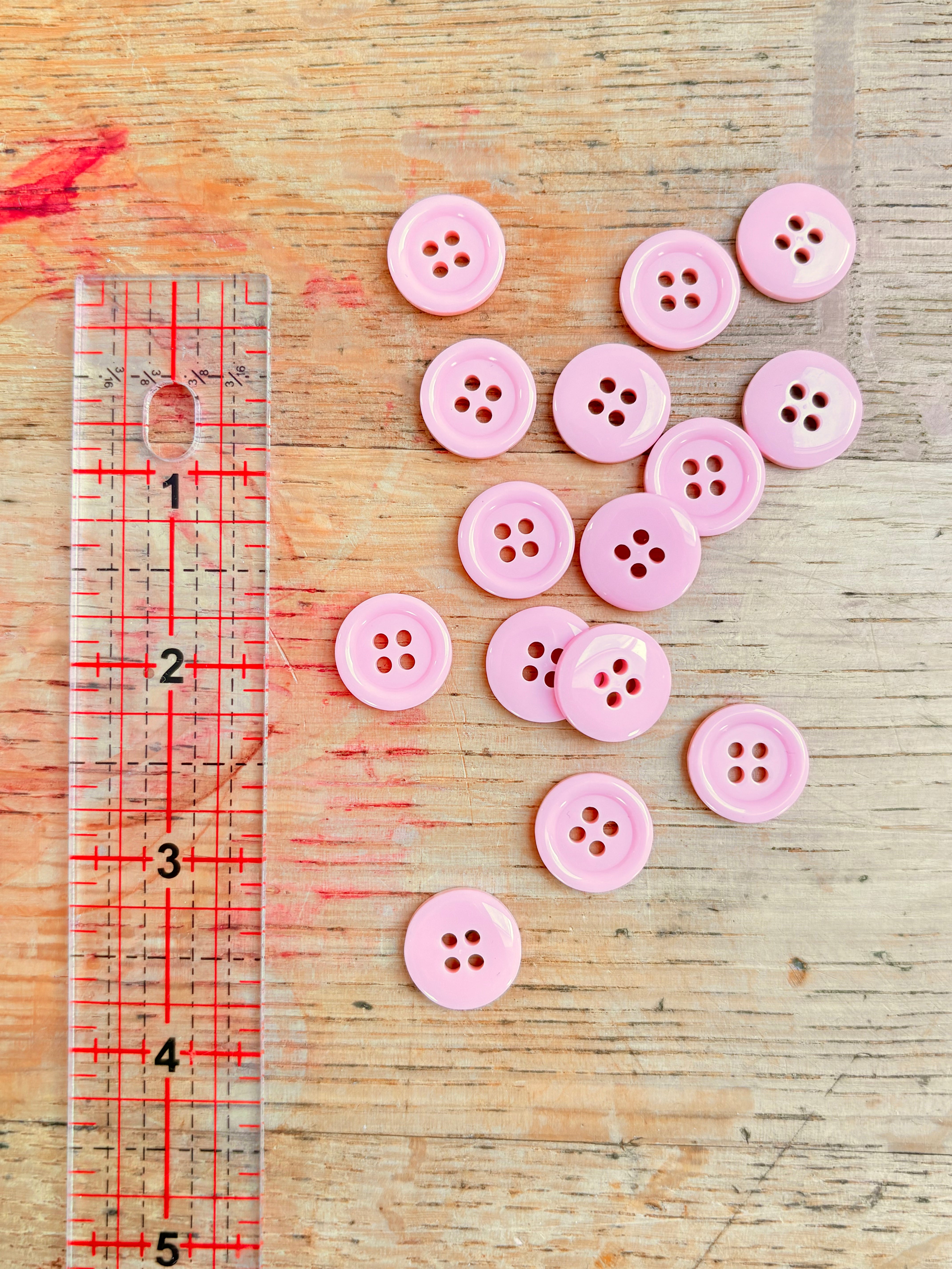 4 Hole Ring Edge Pale Pink Buttons - 15mm is backordered and will ship as soon as it is back in stock.