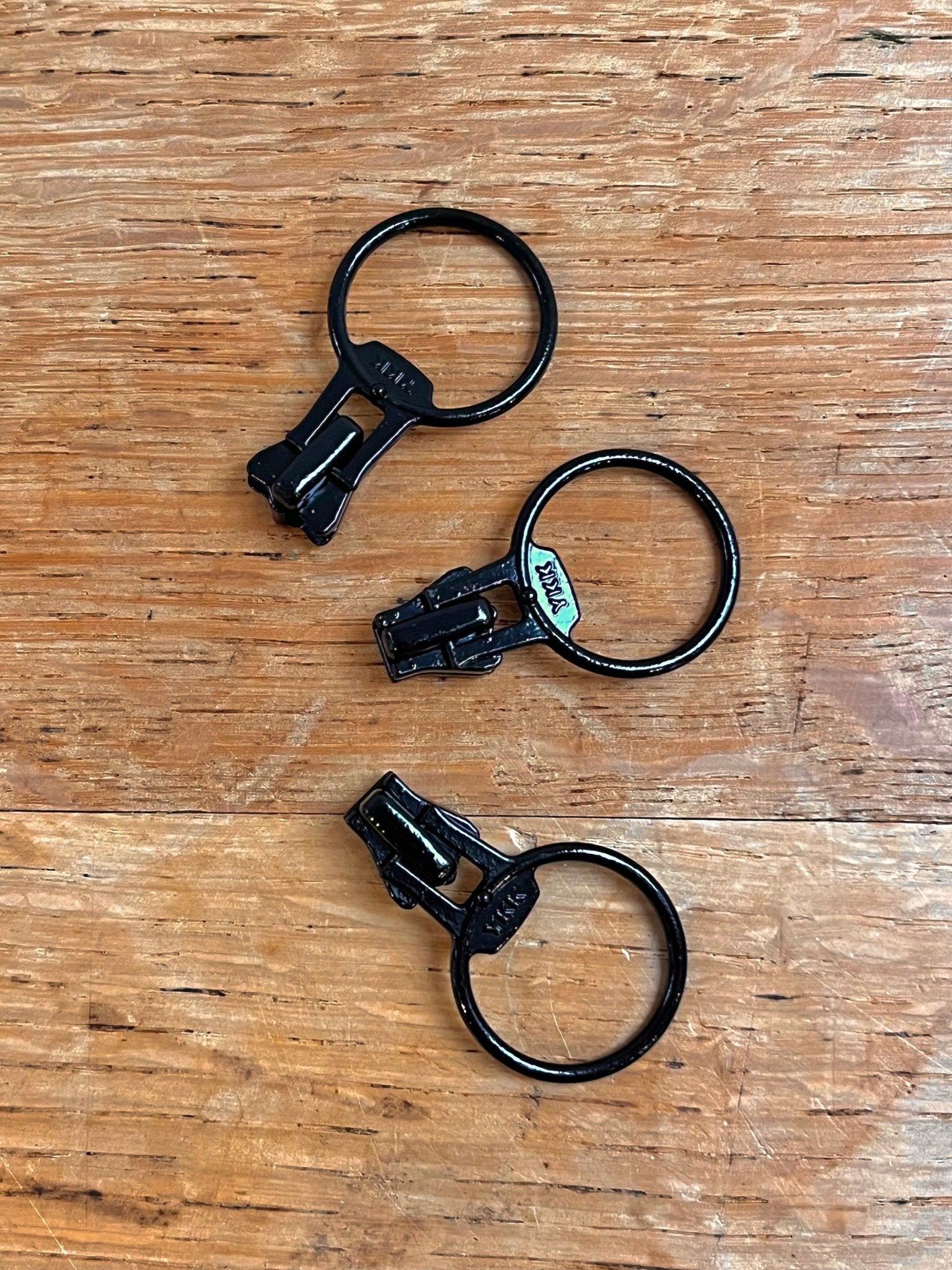 One packet contains 3 coated metal coloured zip pulls with this statement ring style pull.  They can be threaded on either way to have a zip that opens in any direction.  The sides come separately - 1.2m per pack.