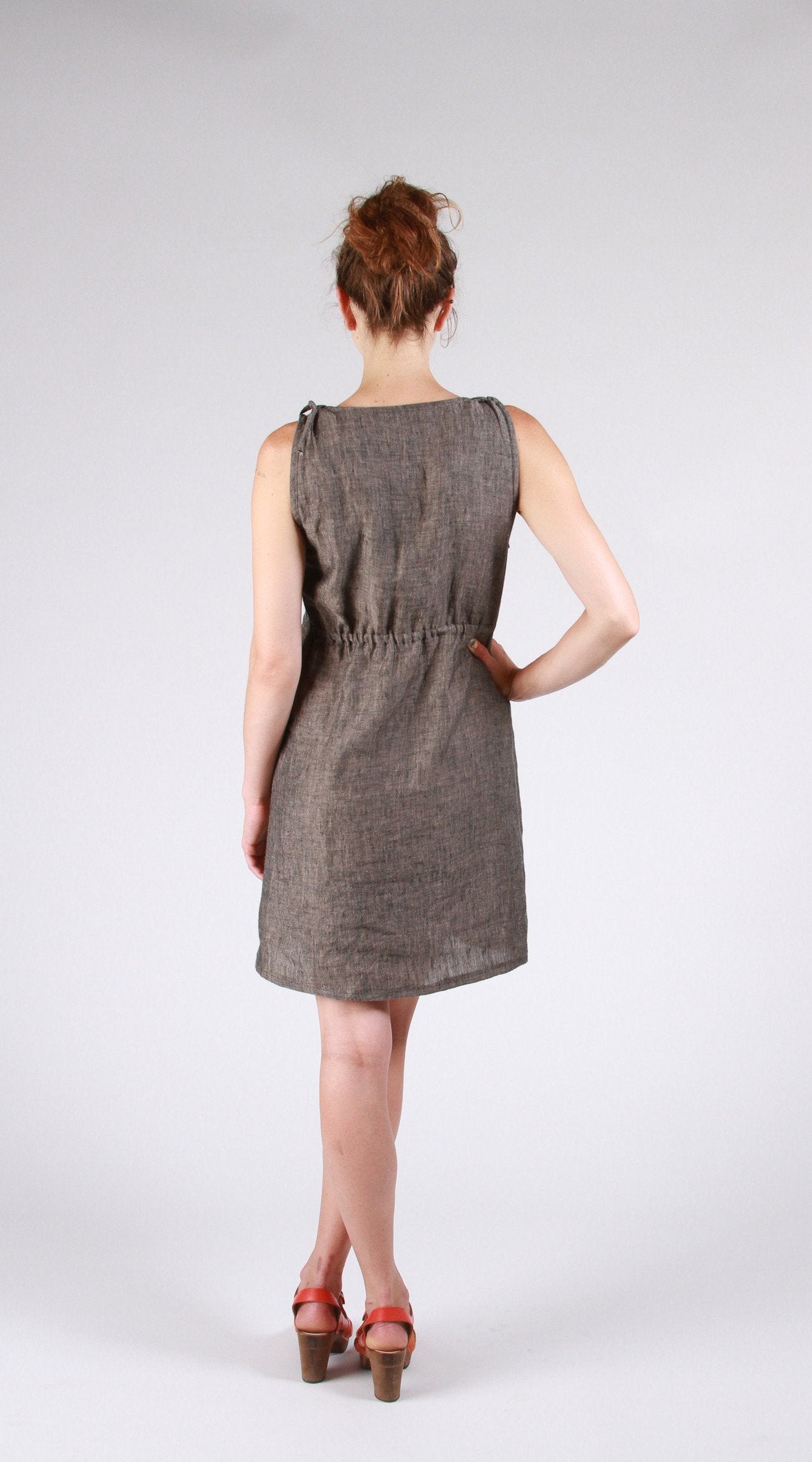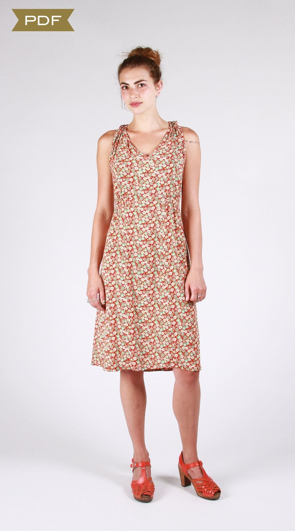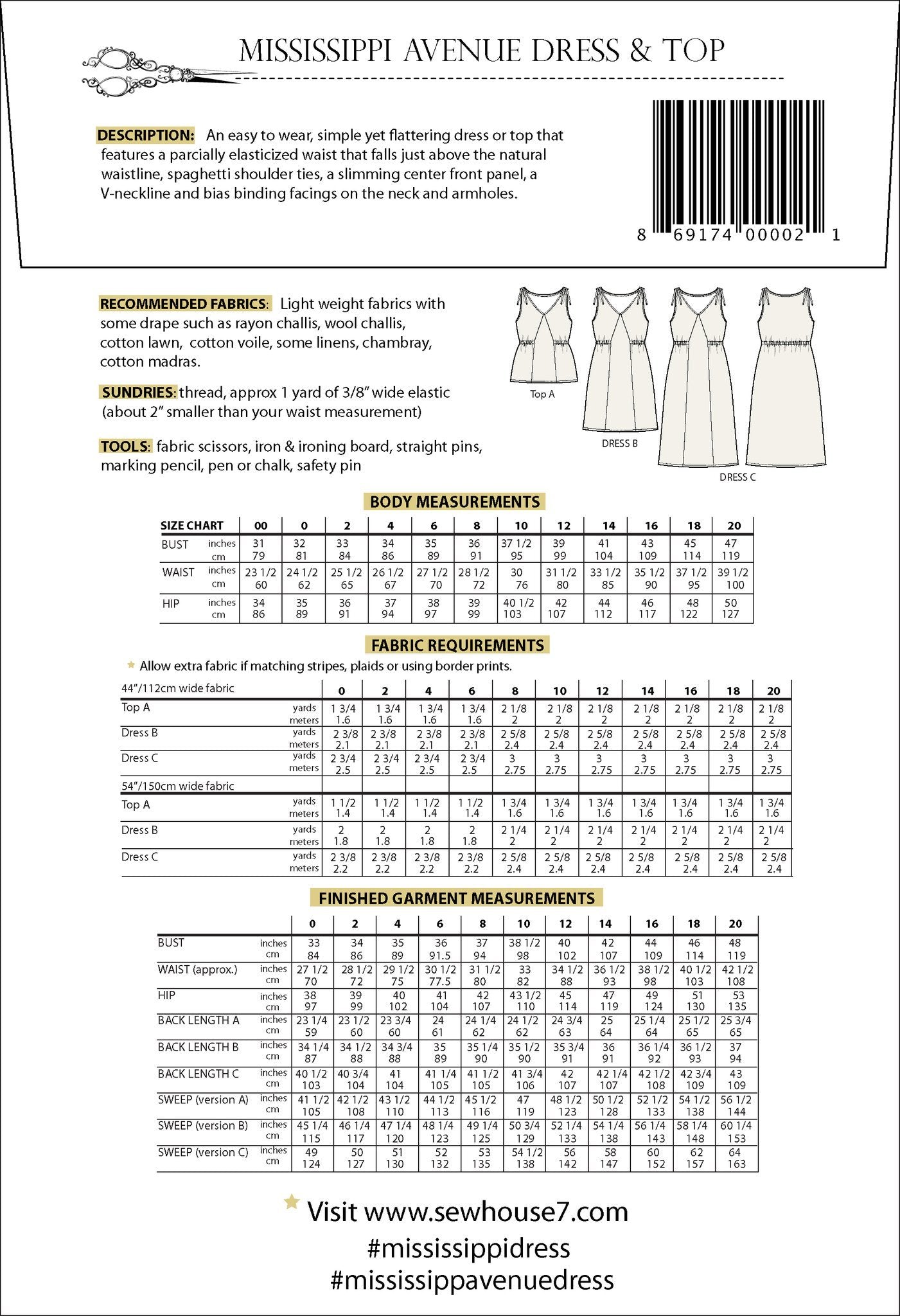 The Mississippi Avenue Dress or Top has a very feminine, flattering and easy style. As a sleeveless style, it lends itself to spring and summer dressing however, it makes a great transition piece when paired with a cardigan, tights and boots. It can have a vintage look to it when sewn in a fabric such as rayon challis or something with some drape to it. It can have a more modern look to it when sewn in a crisp linen or cotton. Any way you fashion it, it's a great style. It features a V-neckline, spaghetti shoulder ties, an elastic almost empire waist (slightly higher than the natural waistline) and has a front panel that creates a slimming and interesting design feature.