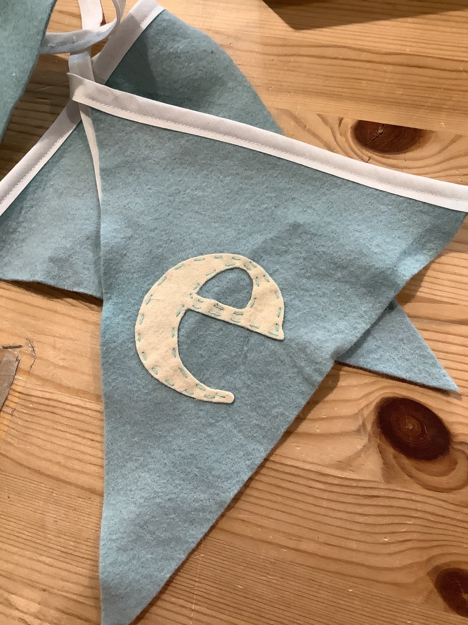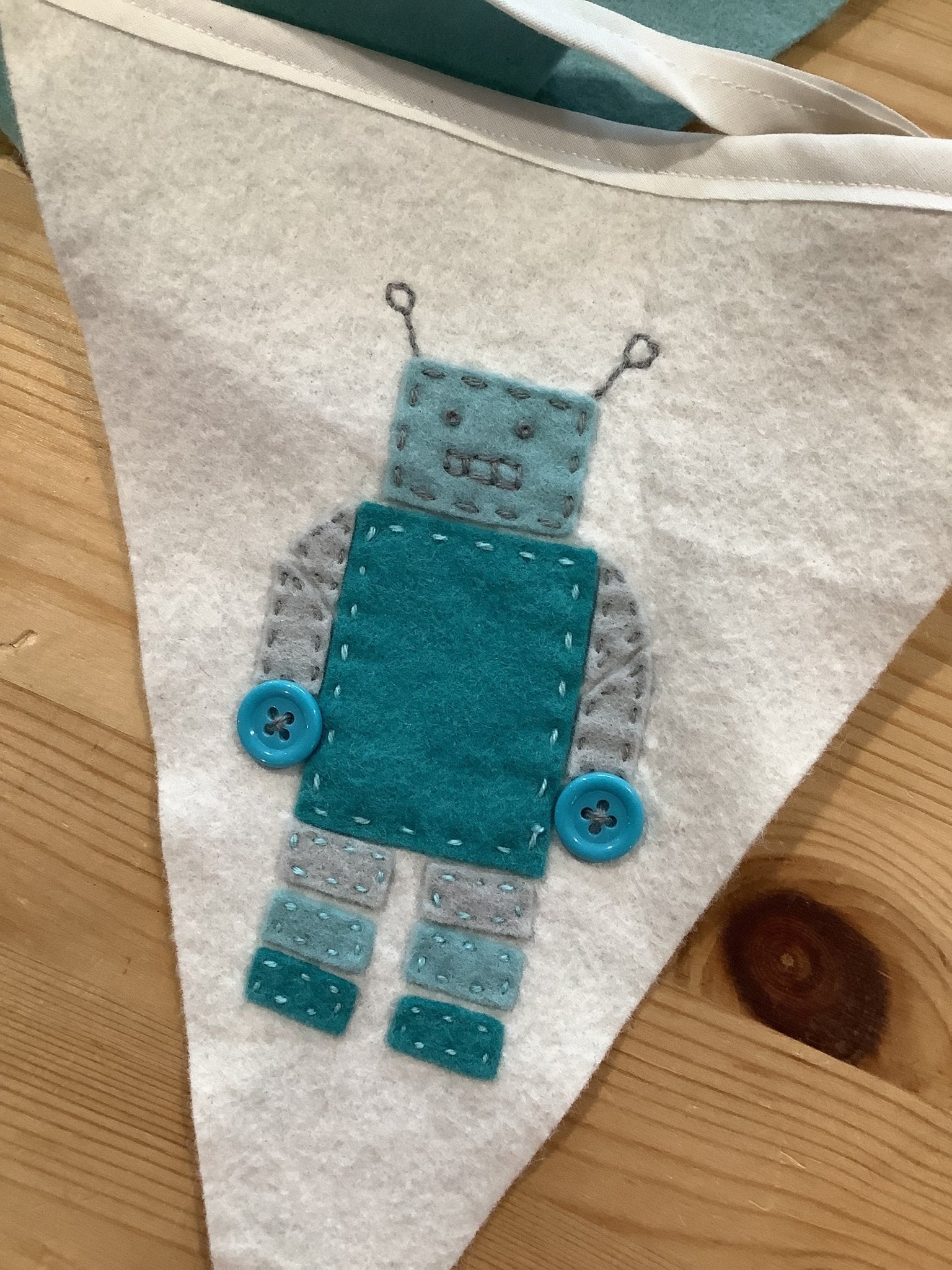 A kit to make the loveliest felt bunting. Choose either a blue and white version featuring robot appliques or thepink and white version featuring apple and flower appliques. Each flag measures about 25cm from top to bottom, and depending on the length of the name you choose, you can make up to 4metres of bunting.