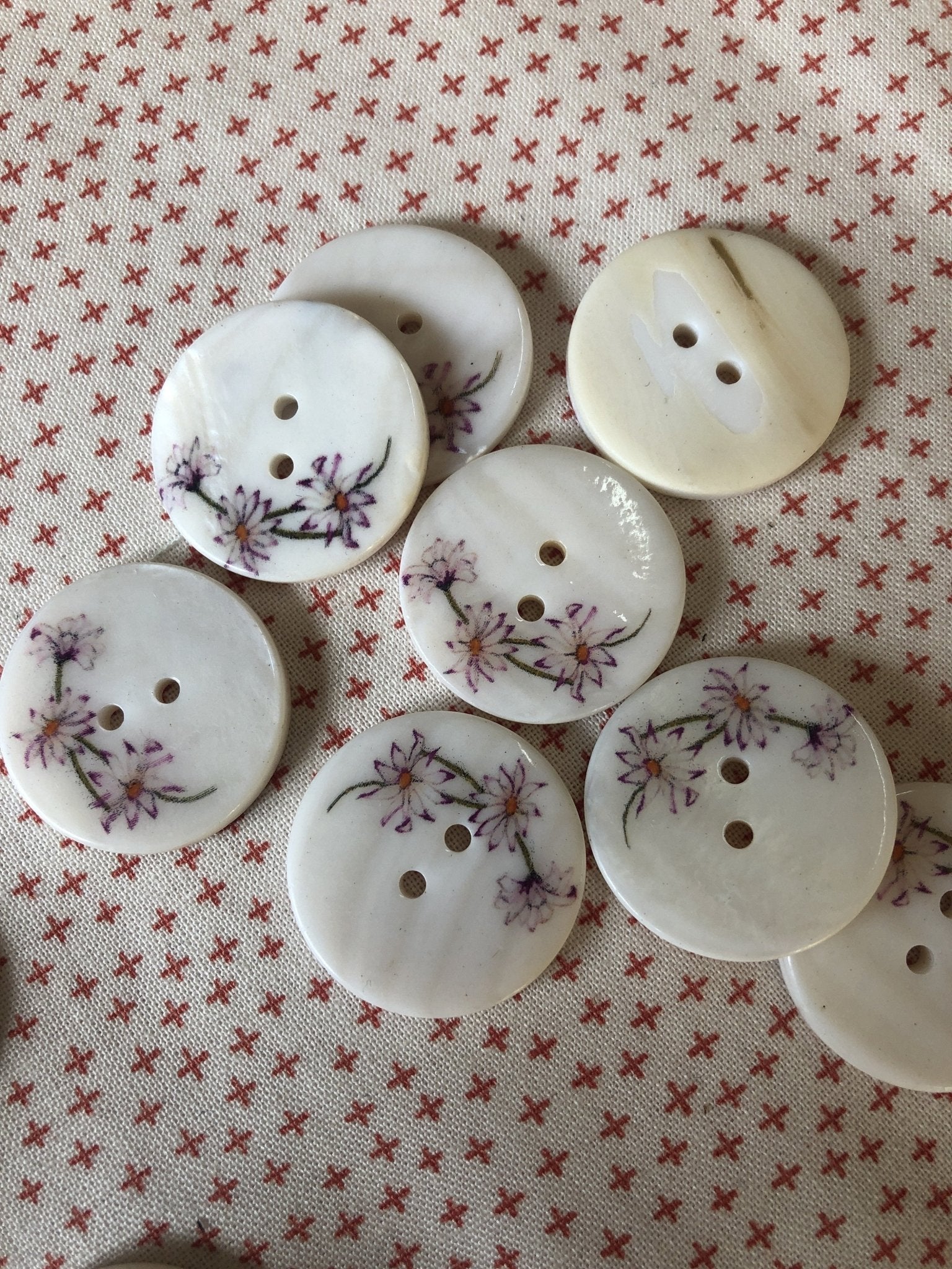 Pretty daisies printed on a river pearl button. The button measures 26mm in diameter, and is priced individually.
