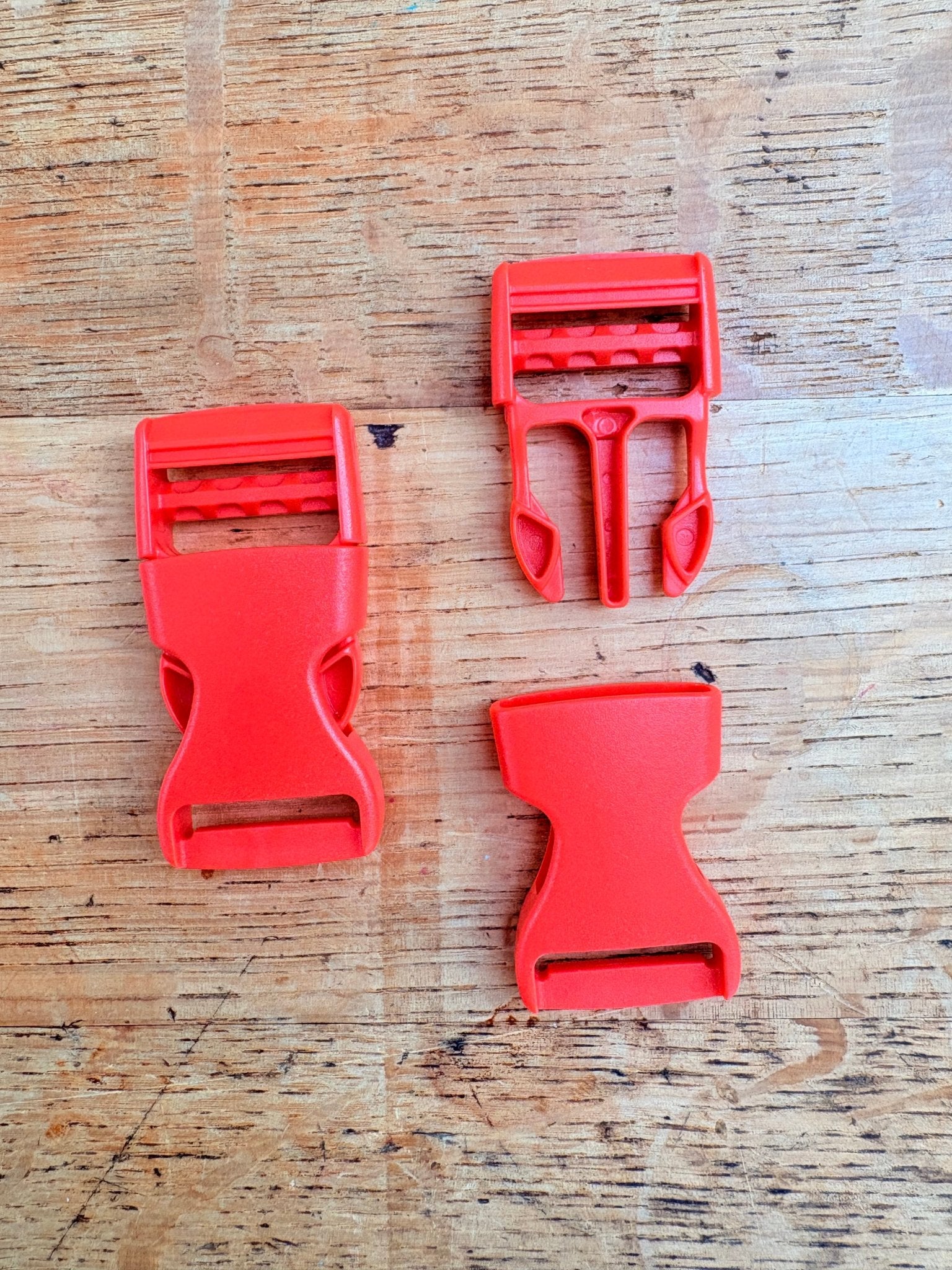This type of buckle is used wherever an easy-opening webbing fastening is required, such as rucksack straps. Can be opened with one hand by squeezing tabs on each side of the buckle to release.