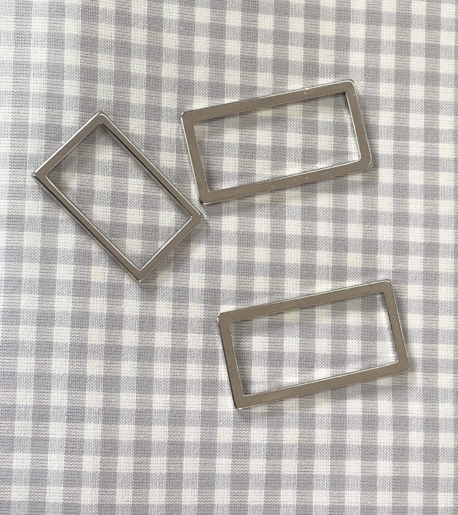This rectangular d-ring is shiny nickel and measures 45mm x 20mm (large) or 35mm x 25mm (small). The price is per one.