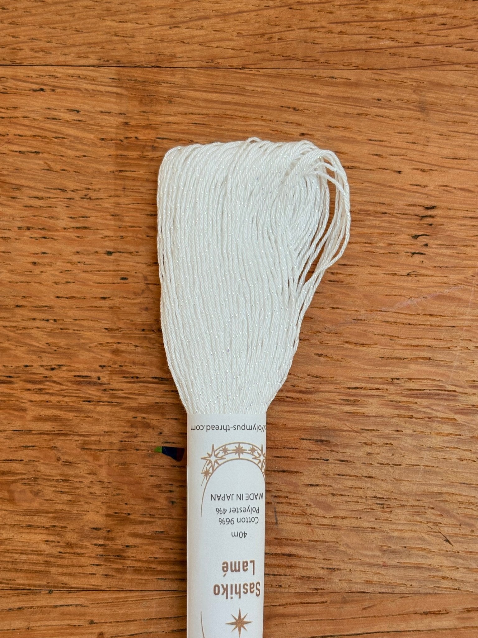 Sashiko Lame is a sashiko thread for those who want to create something a little different from the usual sashiko.  Why not add a little sparkle to your usual sashiko?  The subtle lame sparkle in this thread is not overwhelmingly glittery - it just adds a gentle glint to your work.  This hand sewing thread is single stranded and easy to sew with no shedding or twisting.  Sew up your regular sashiko projects with a little bit of glitter included.