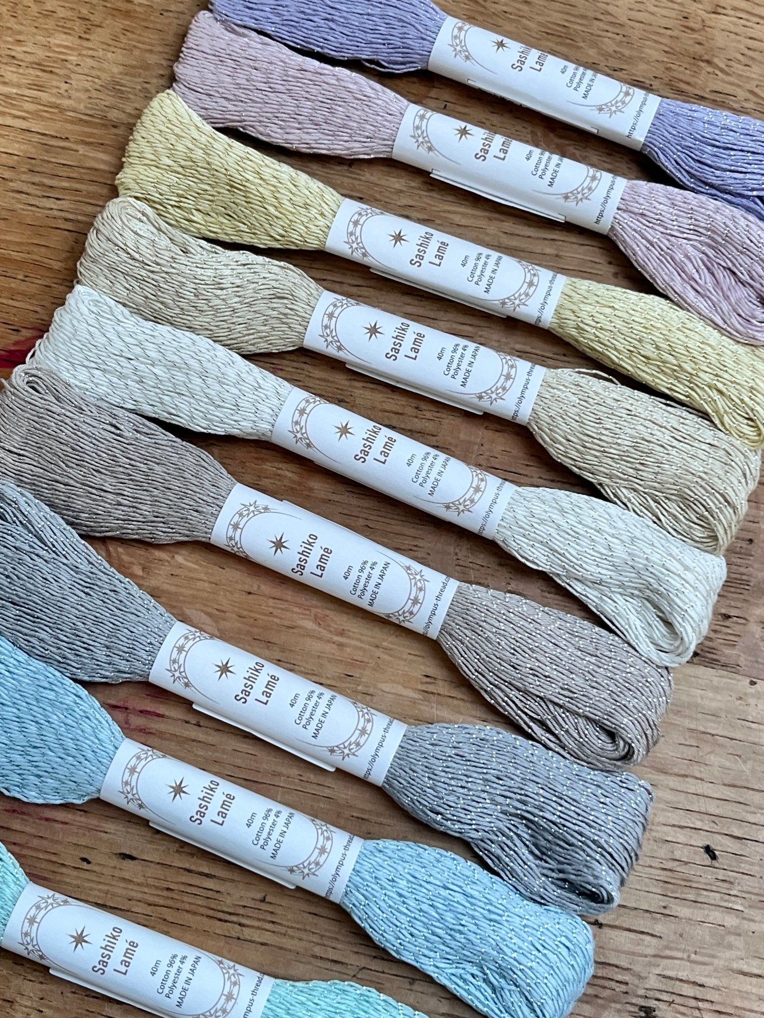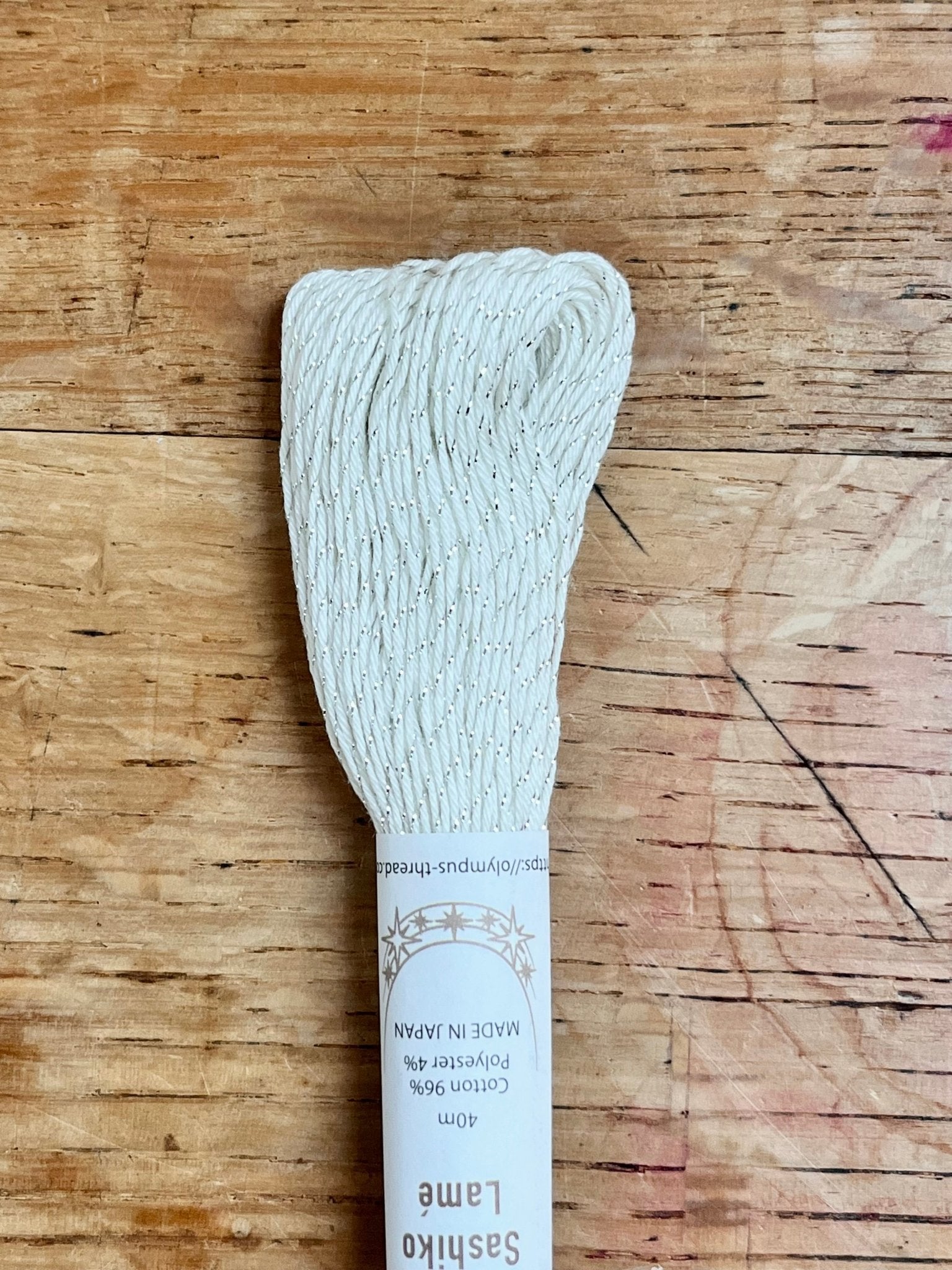 Sashiko Lame is a sashiko thread for those who want to create something a little different from the usual sashiko.  Why not add a little sparkle to your usual sashiko?  The subtle lame sparkle in this thread is not overwhelmingly glittery - it just adds a gentle glint to your work.  This hand sewing thread is single stranded and easy to sew with no shedding or twisting.  Sew up your regular sashiko projects with a little bit of glitter included.