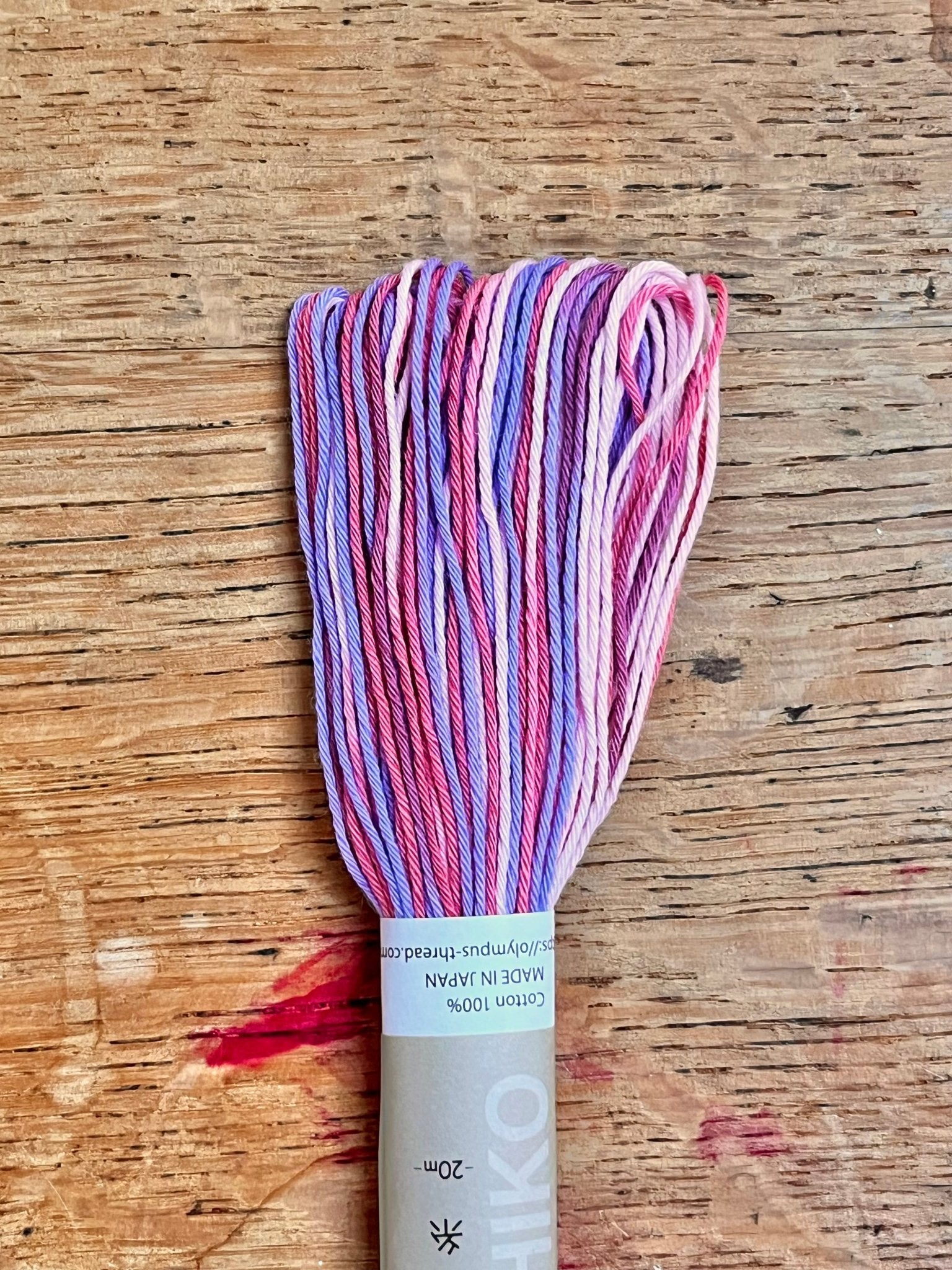 100% cotton sashiko thread in variegated pink, lilac and purple colours.