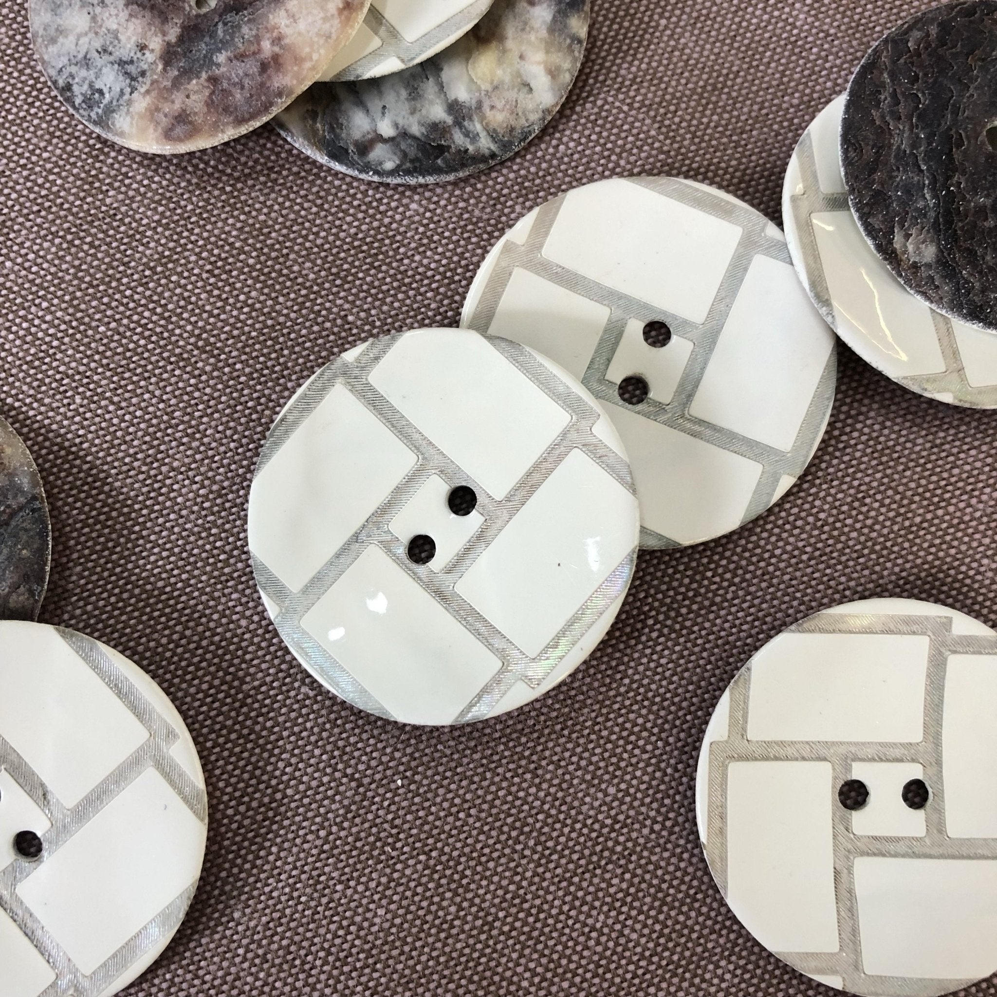 Geometric white lasered shell button, 28mm in diameter.  The price is per button.