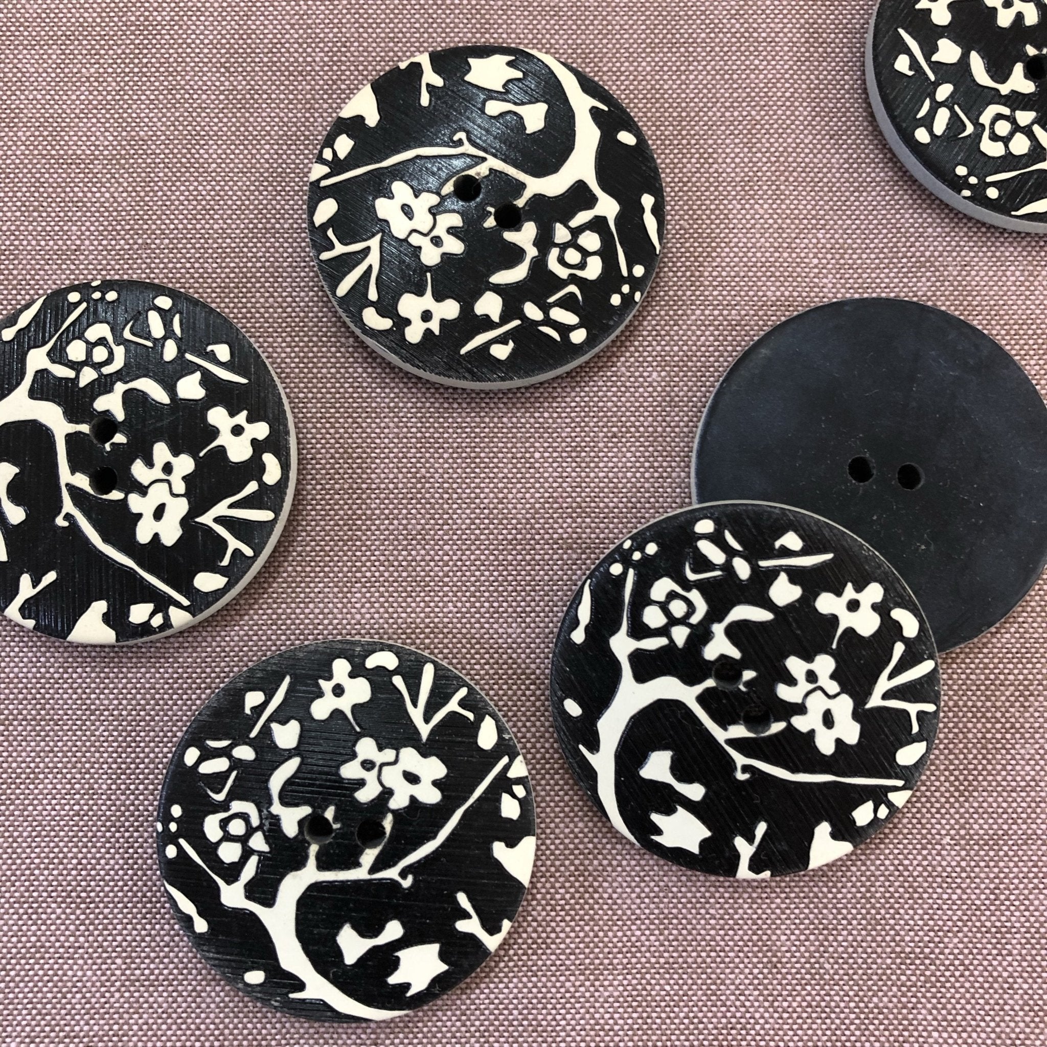 Lovely white willow design pattern on a black background.  This button is 34mm in diameter and they are sold individually.