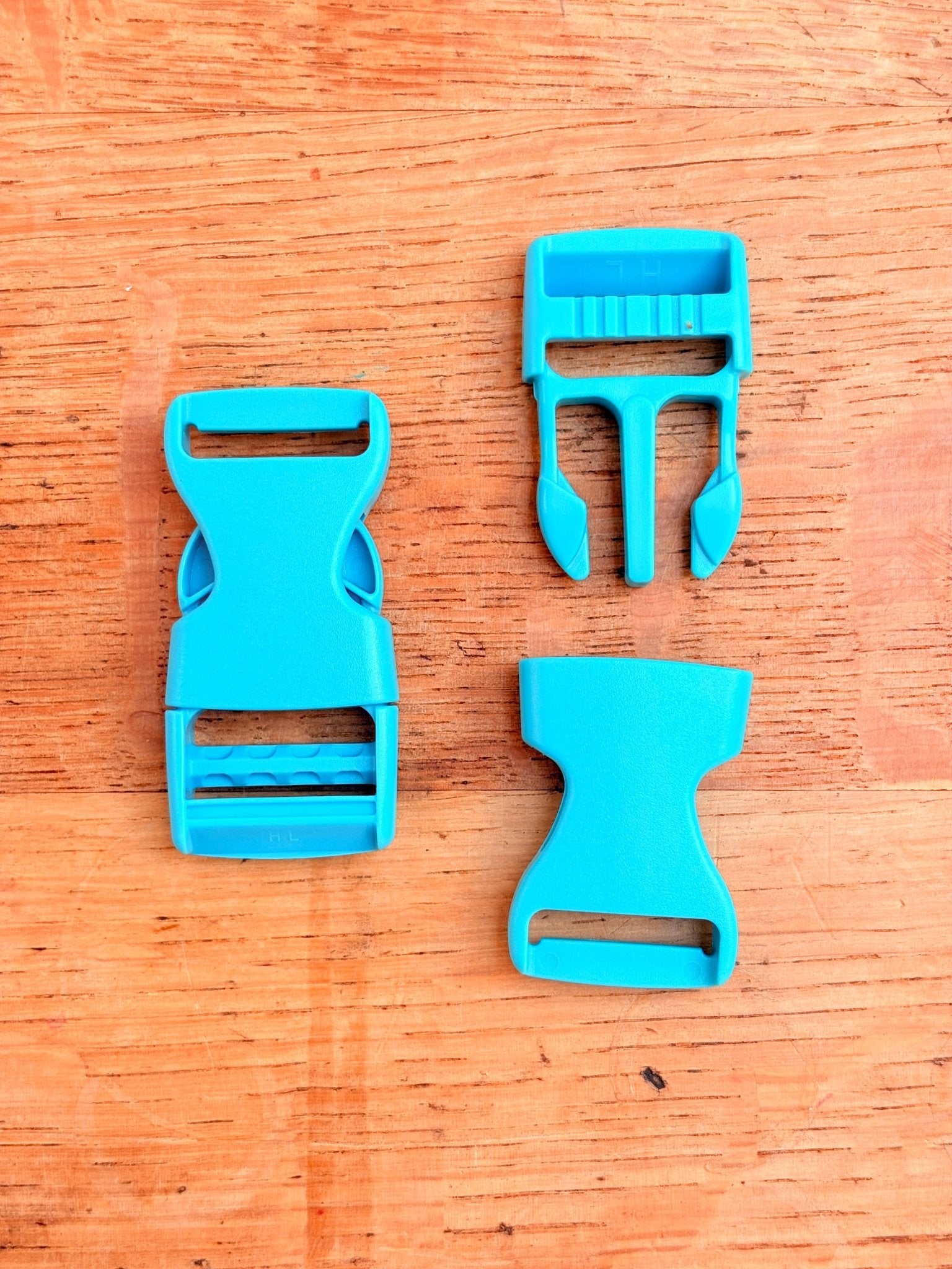 This type of buckle is used wherever an easy-opening webbing fastening is required, such as rucksack straps. Can be opened with one hand by squeezing tabs on each side of the buckle to release.