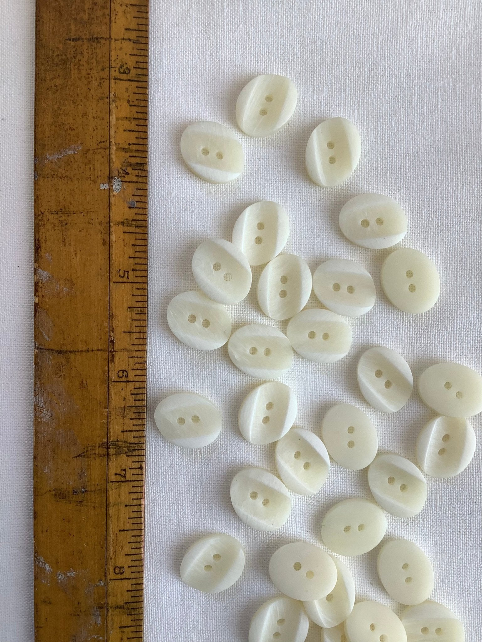 This button is a lovely creamy colour with a lighter cream swirled in to look like soft white clouds or a clean white marble. the button is an oval shape with a smooth dip though the centre from edge to edge, with the holes placed in the centre and comes up on each side of the long points.