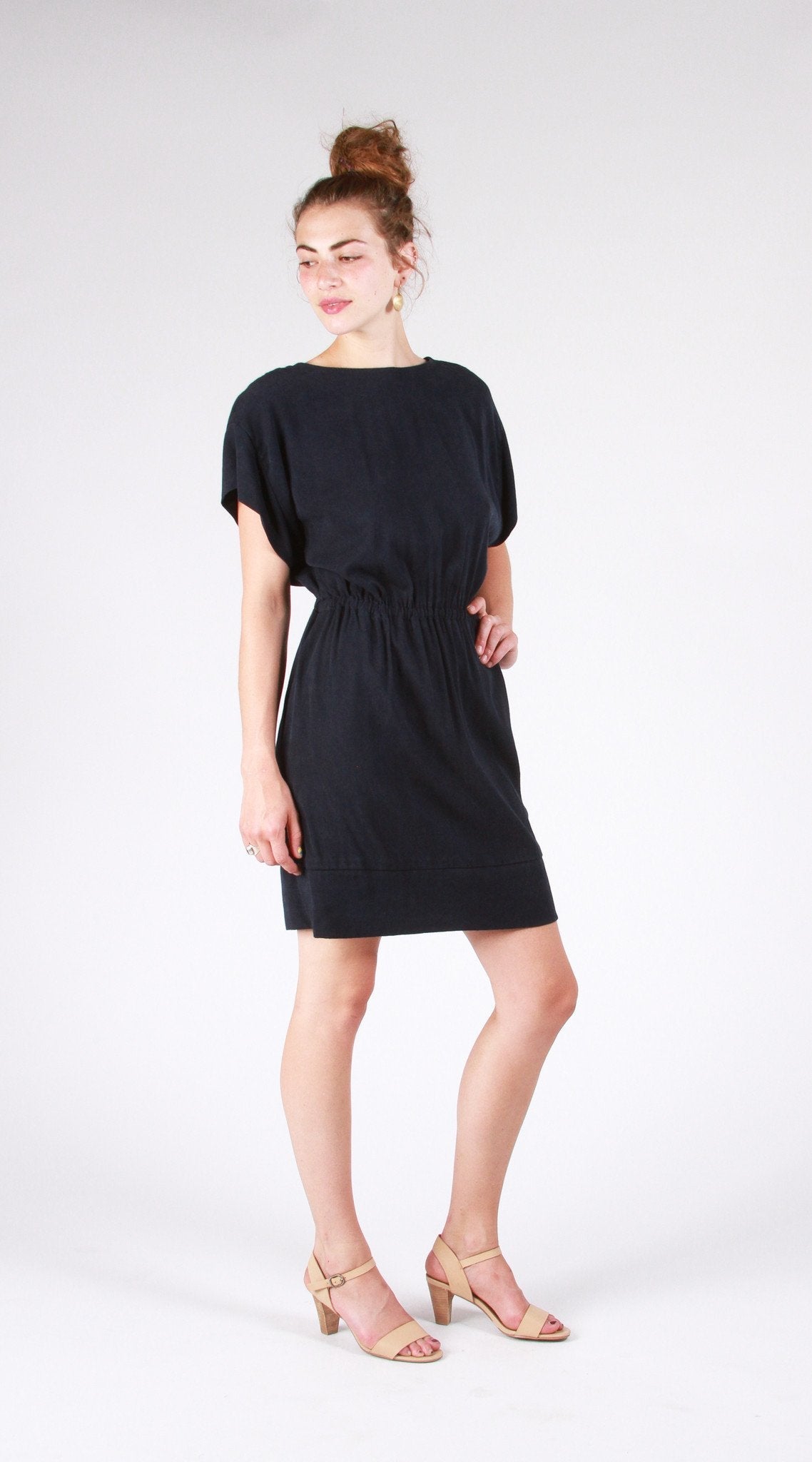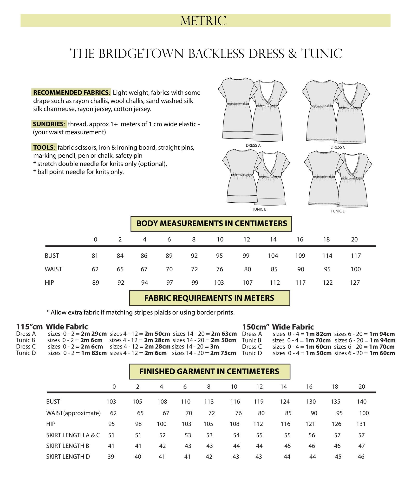 The open back is stunning for an evening look with a pair of heels or dress it down with a camisole underneath or over a pair of jeans for a more modest look. The simple styling makes it quick and easy to sew. It features a loose fitting bodice with drop shoulder short sleeves, an elasticized waist, and a jewel front neckline that becomes a cross over draped open back. Dress A and Tunic B have a bottom band and Dress C and Tunic D have standard turned up hems that are more suitable for knits. The dress hems land above the knees and the Tunics land at the mid-thigh. You may want to think about sizing down when sewing with knit fabric. This is a beginner level pattern.