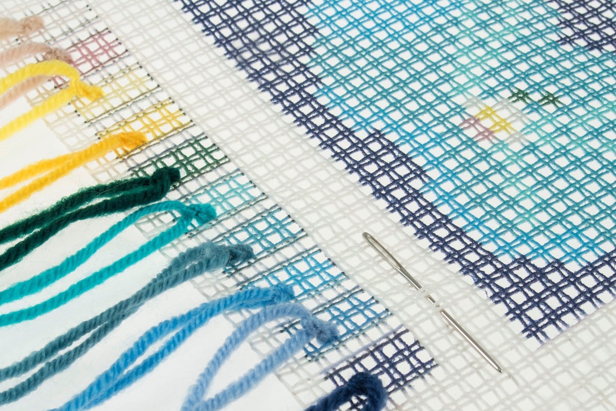 Kit includes: pre-printed design, 8 count, large hole canvas; acrylic tapestry yarns; tapestry needle; and a cotton cushion back with zip and full instructions.