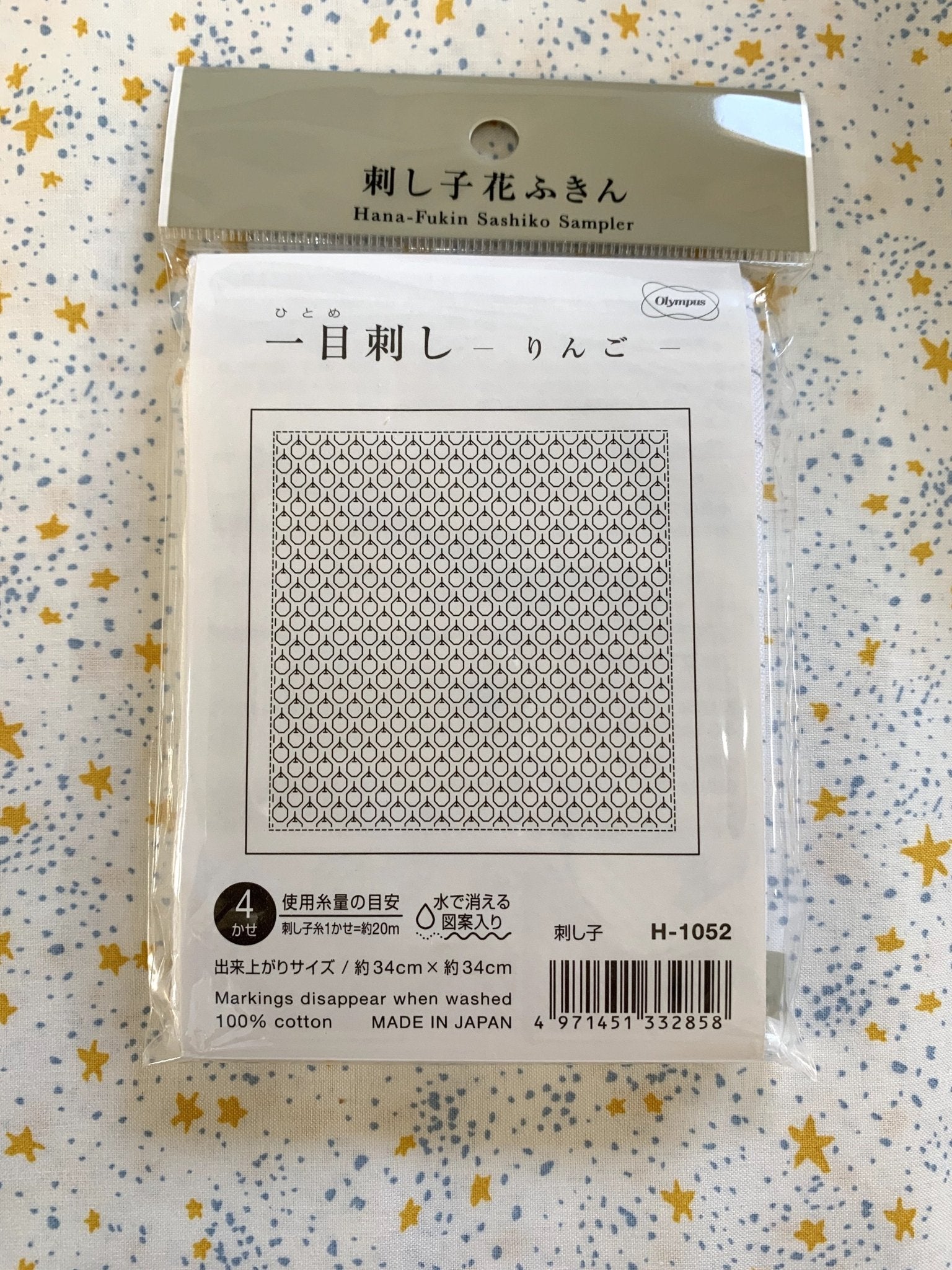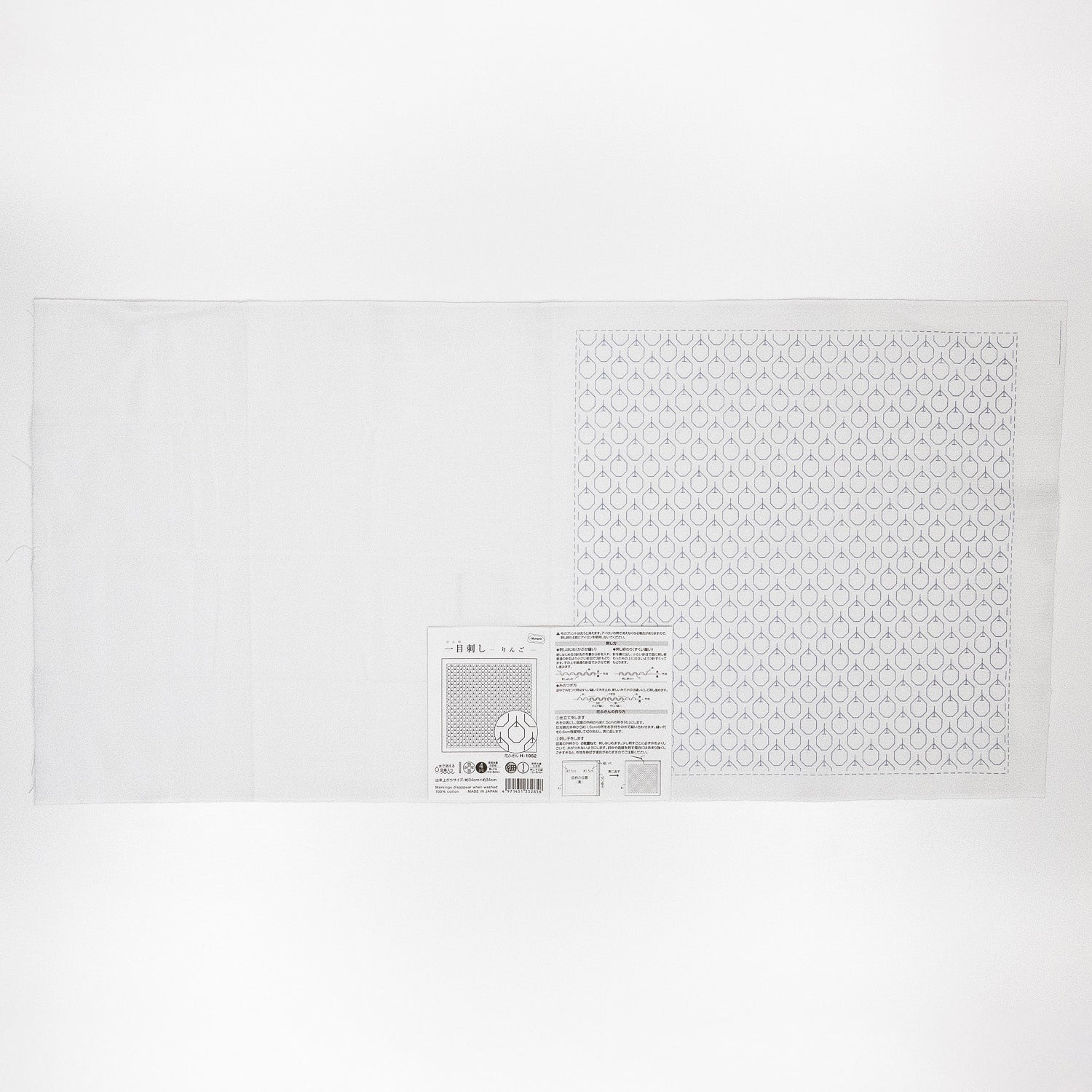 Sashiko Sampler - 33cm square pre-printed with washable ink. This kit is printed on white. The smaller scale and more intricate pattern of this sampler is perfect if you have completed a beginner sampler and are looking for a more challenging design!