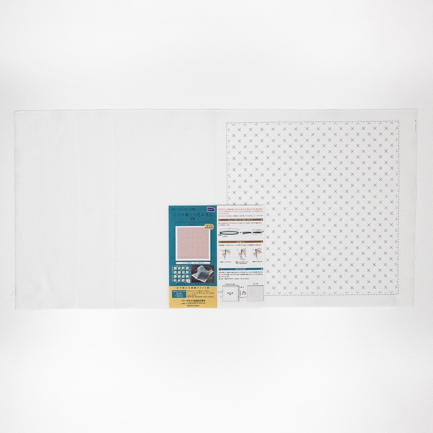 Sashiko Sampler - 33cm square pre-printed with washable ink. This kit is printed on white. The smaller scale and more intricate pattern of this sampler is perfect if you have completed a beginner sampler and are looking for a more challenging design!