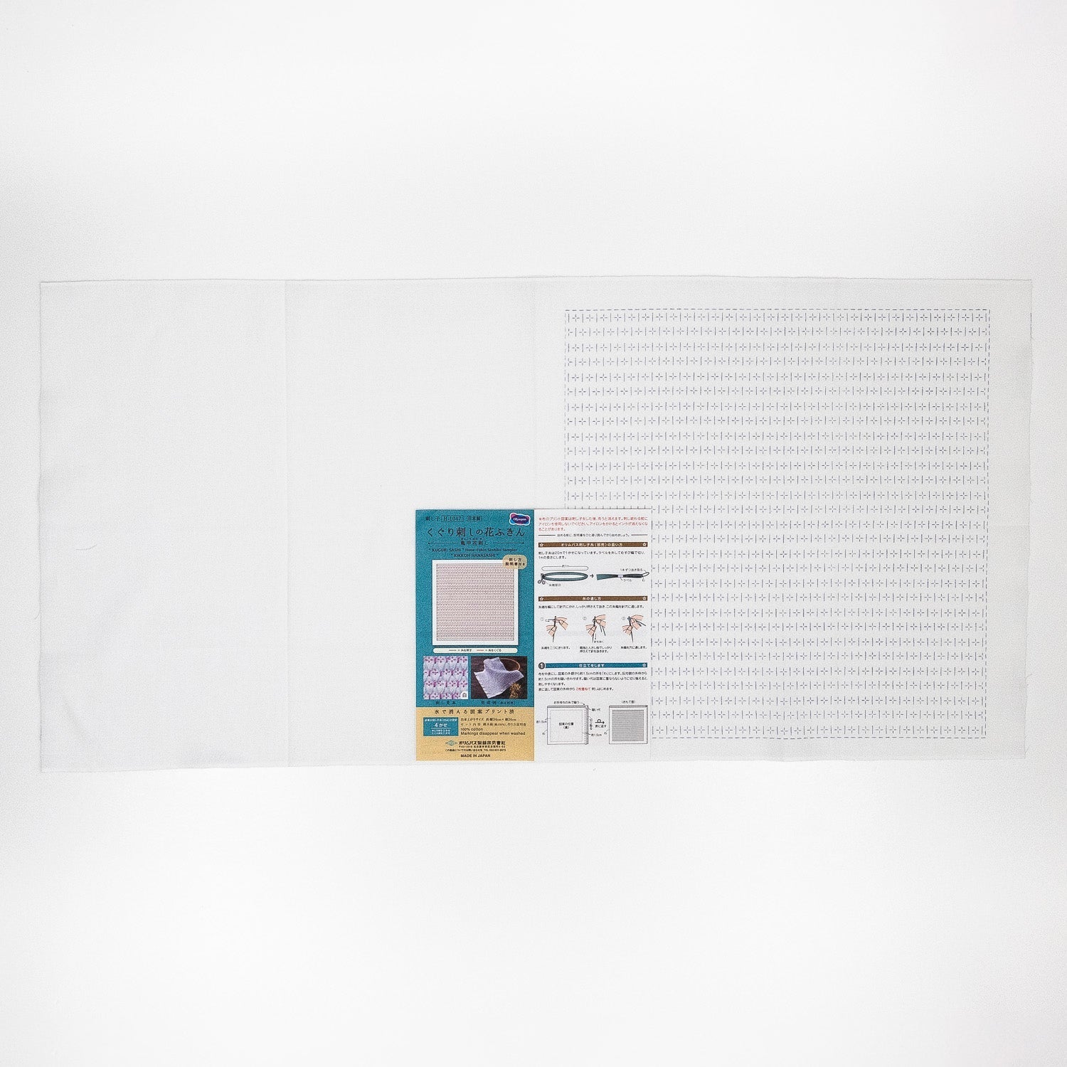 Sashiko Sampler - 33cm square pre-printed with washable ink. This kit is printed on white. The smaller scale and more intricate pattern of this sampler is perfect if you have completed a beginner sampler and are looking for a more challenging design!