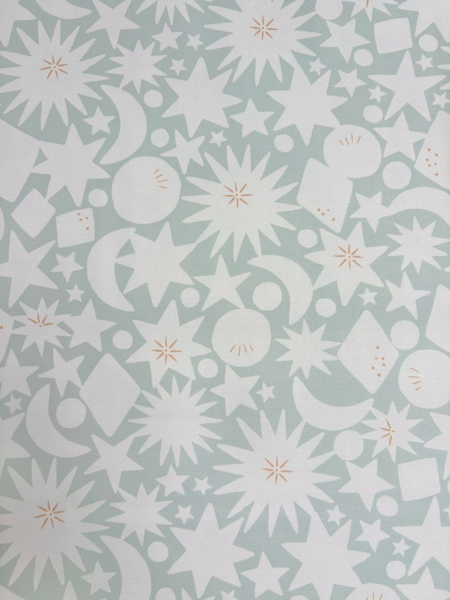 This fabric collection by Paper and Cloth features geometrics, moons and stars, in a modern ivory, mint and gold colour palette.  Perfect for a neutral baby quilt.