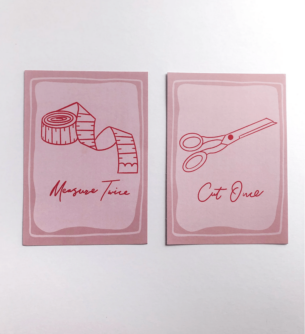 Two A5 prints that serve as the perfect sewing room reminder to measure twice and cut once. Featuring pretty typography and scissor and tape measure illustrations.