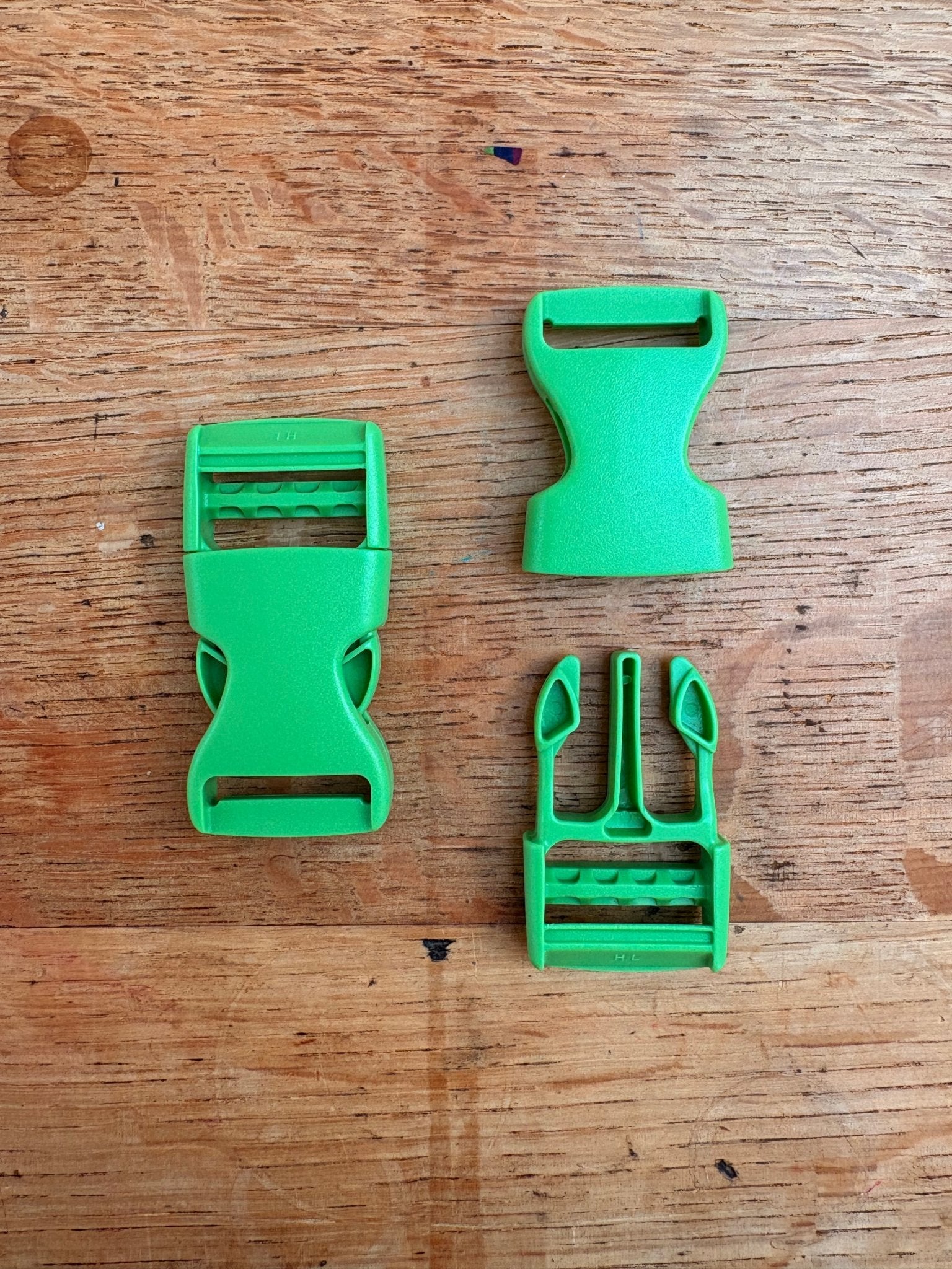 This type of buckle is used wherever an easy-opening webbing fastening is required, such as rucksack straps. Can be opened with one hand by squeezing tabs on each side of the buckle to release.