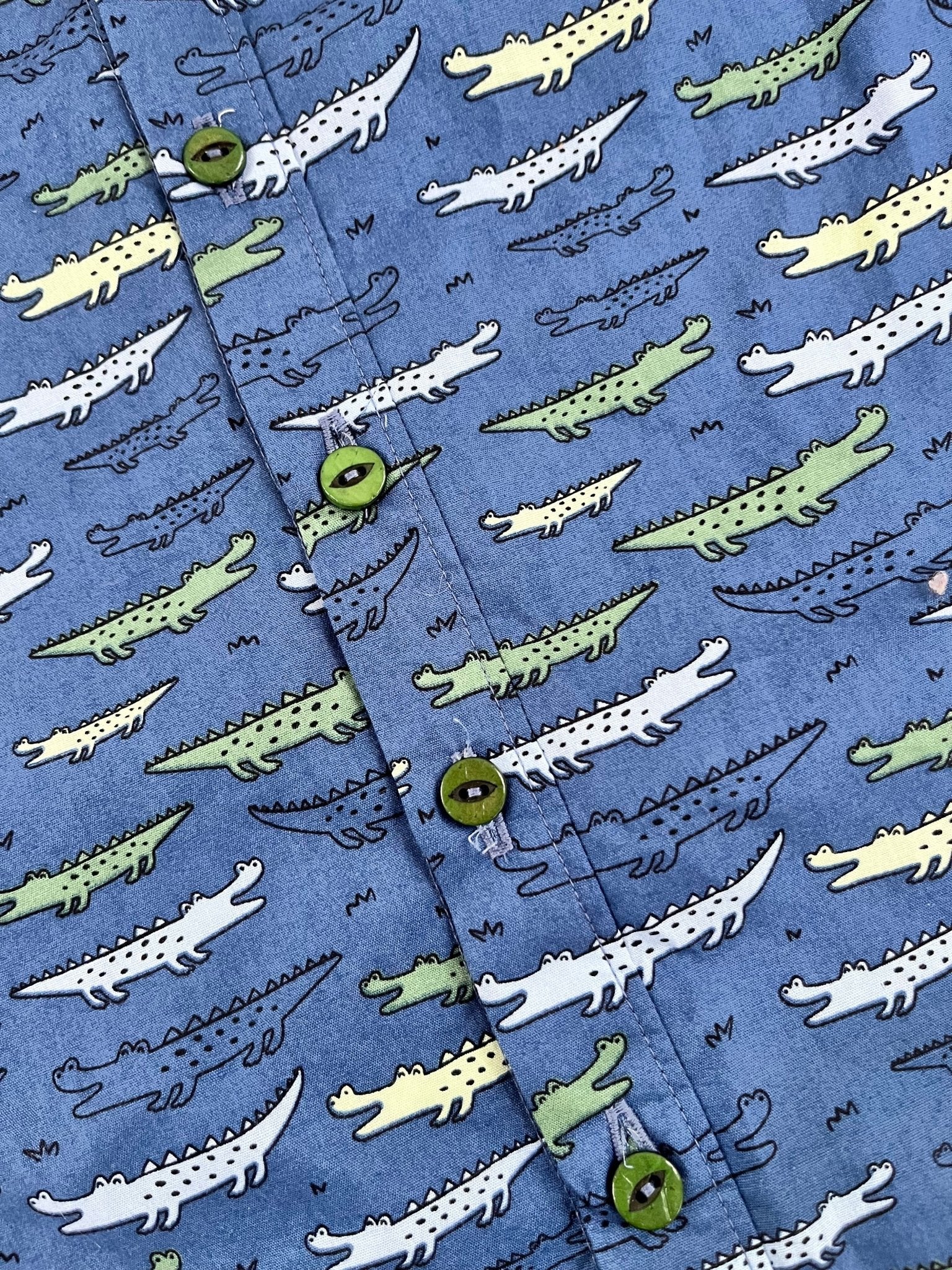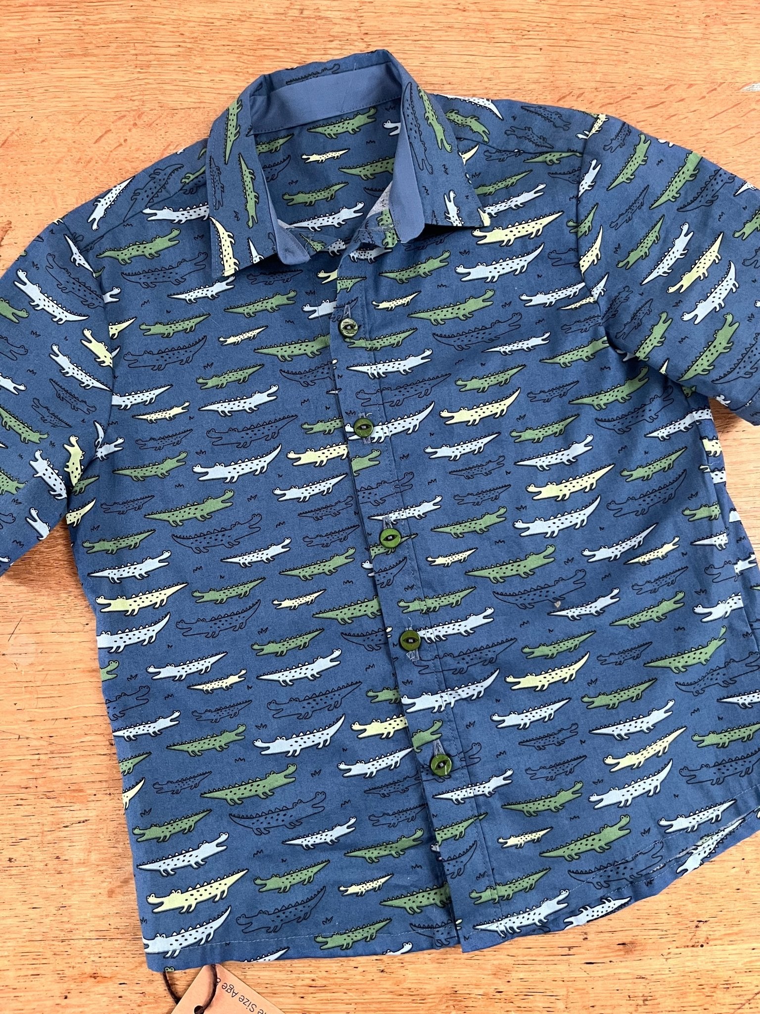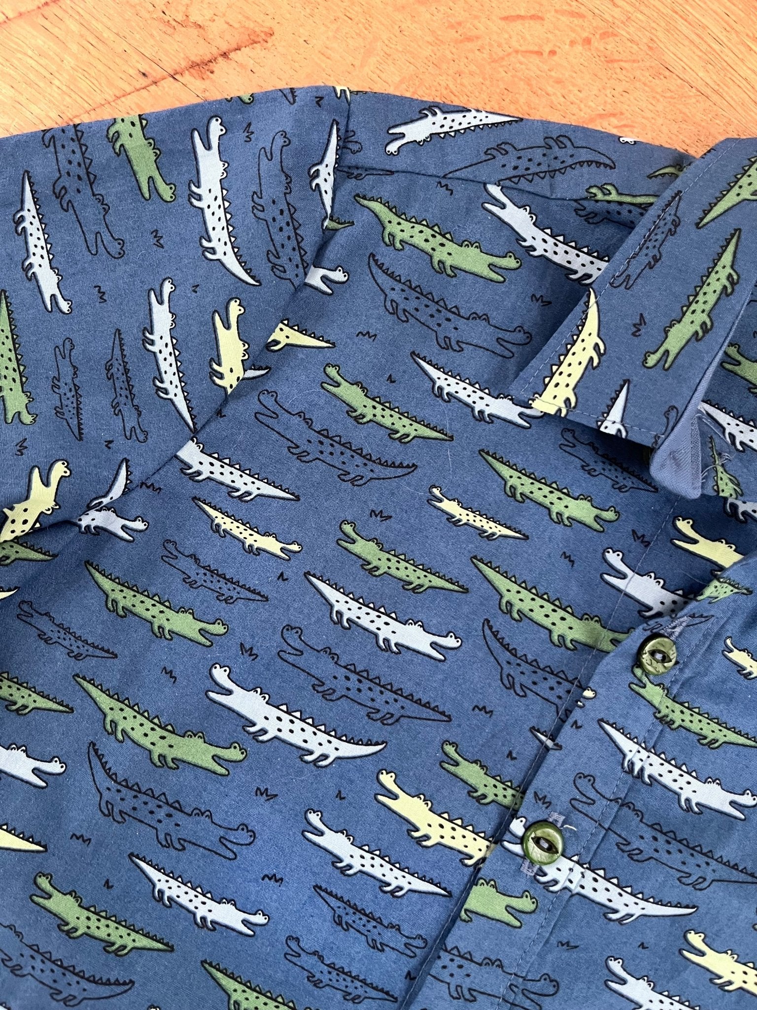 The Max Shirt pattern (which goes up to age 14!), fun alligator fabric, interfacing, and matching thread, and co-ordinating coconut buttons!