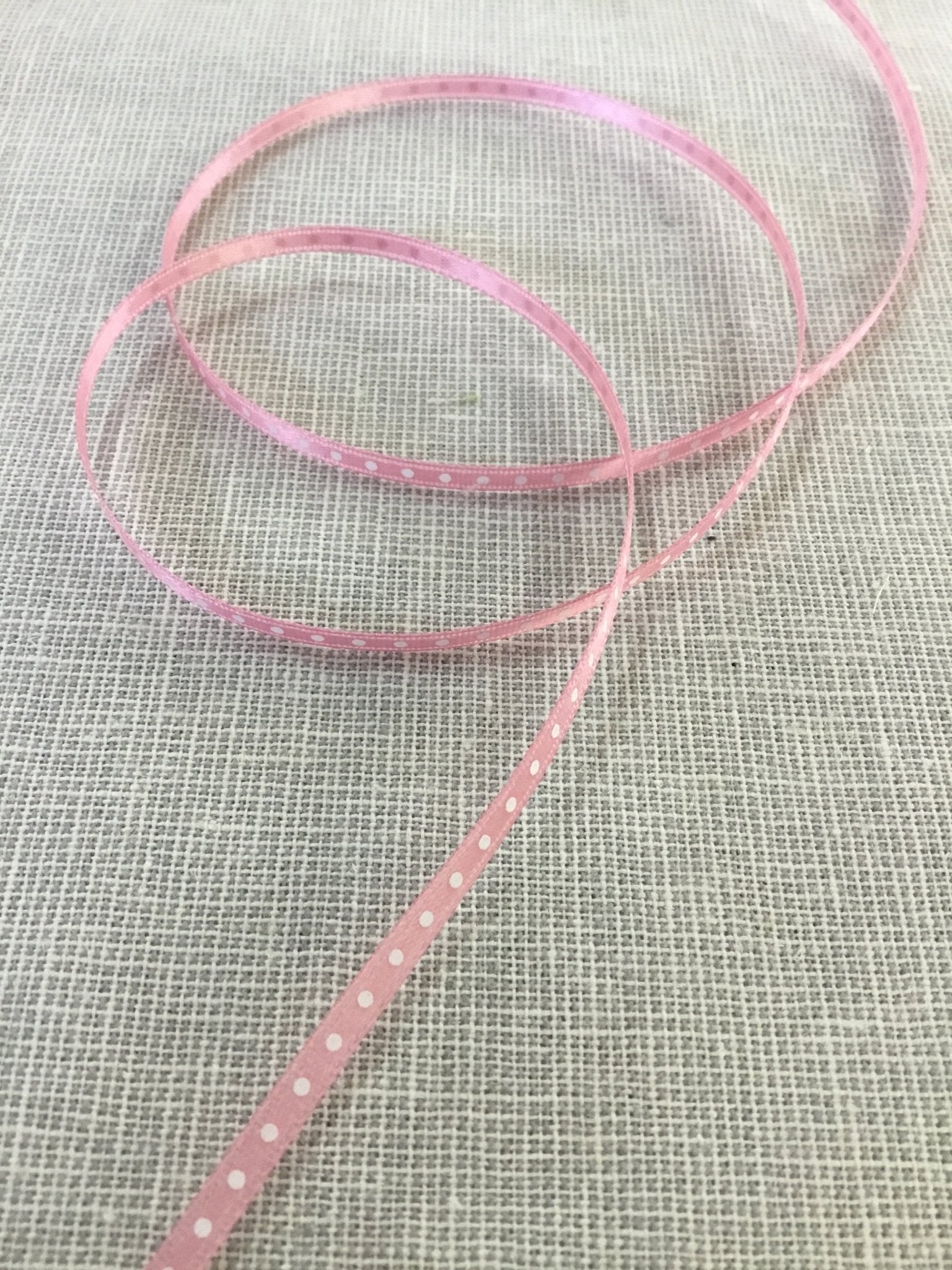 Skinny pale pink ribbon measuring 3mm wide. Price is per meter.