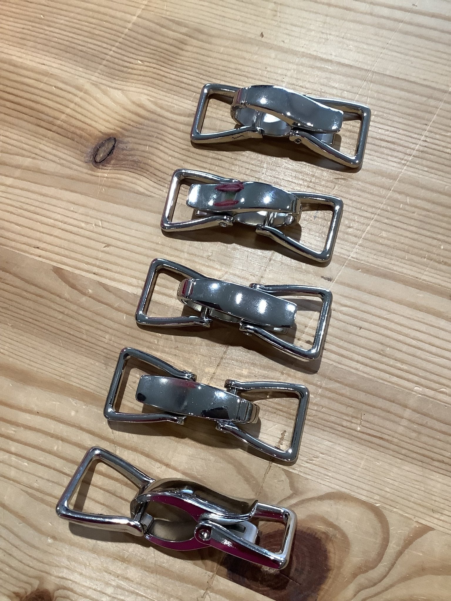 These clips are great for adjoining handles to your bags, or as a fastening on your clothing.  They are 80mm in full length, with each trapezoidal ring measuring approx 20mm along the wider inner measurement  - so would fit a 20mm webbing or tape.