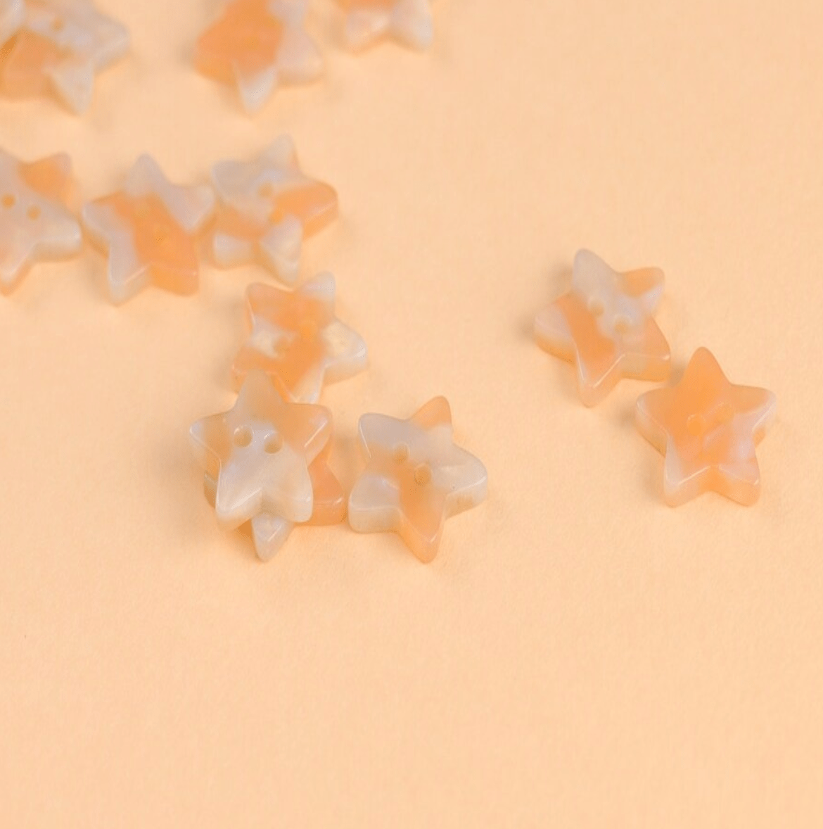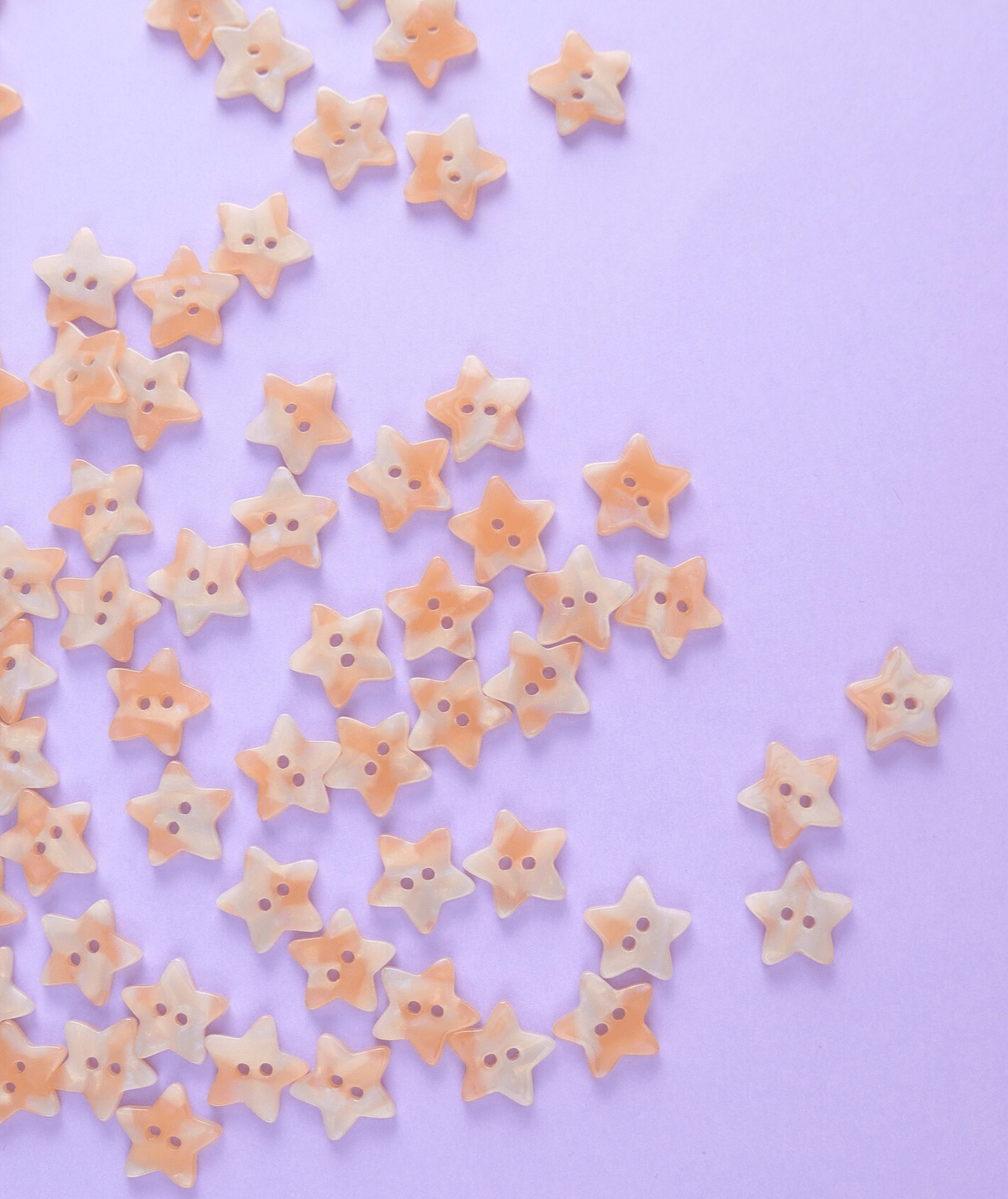 Pearlescent cream and peach star buttons that glimmer when they catch the light.