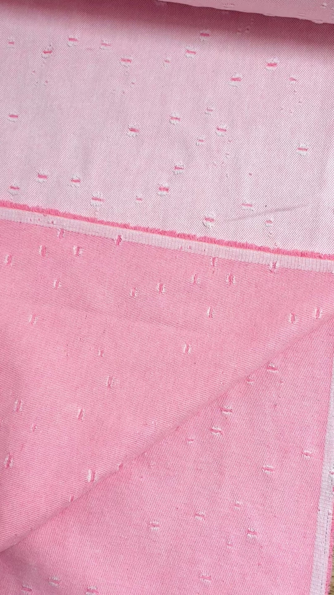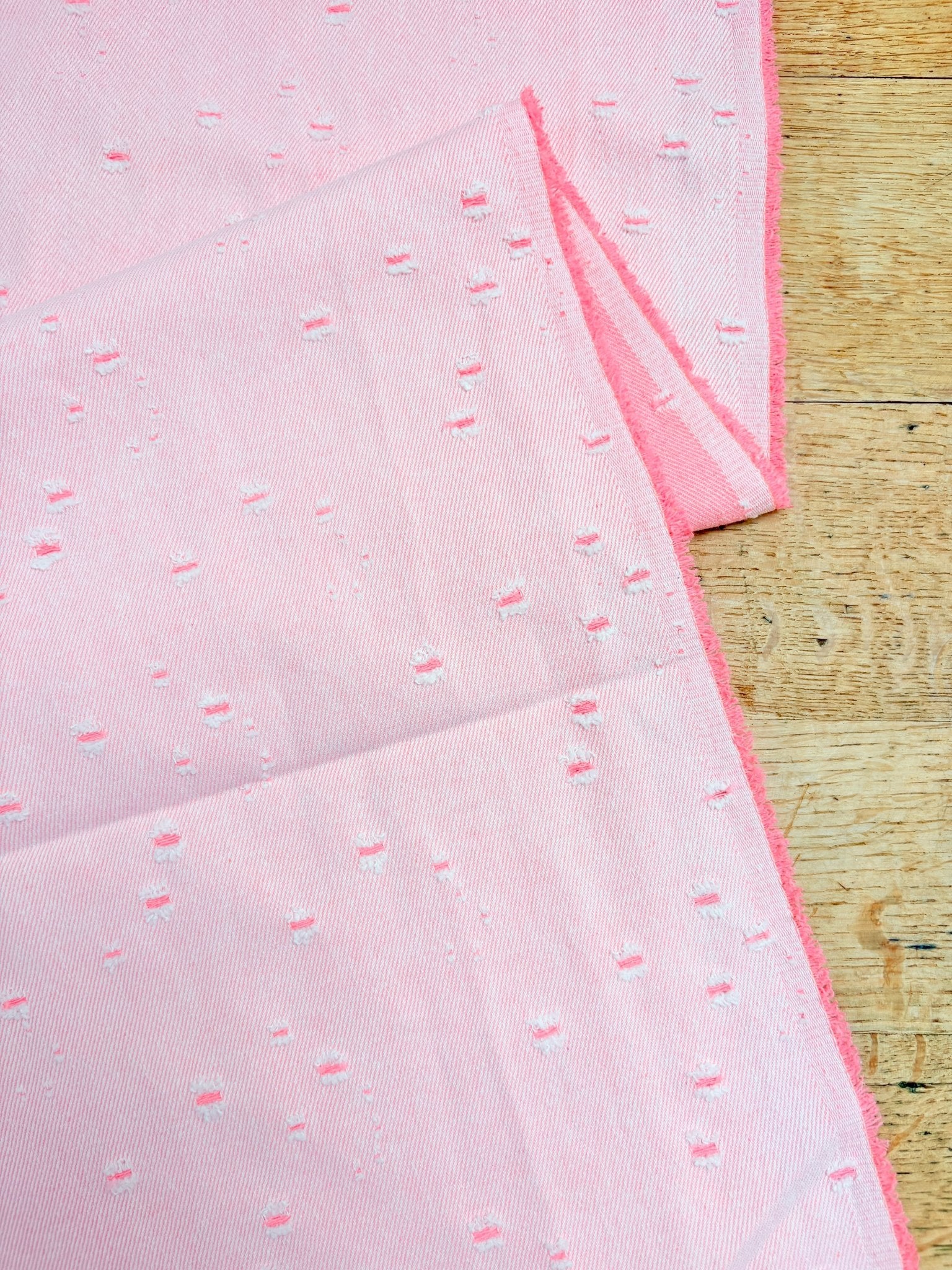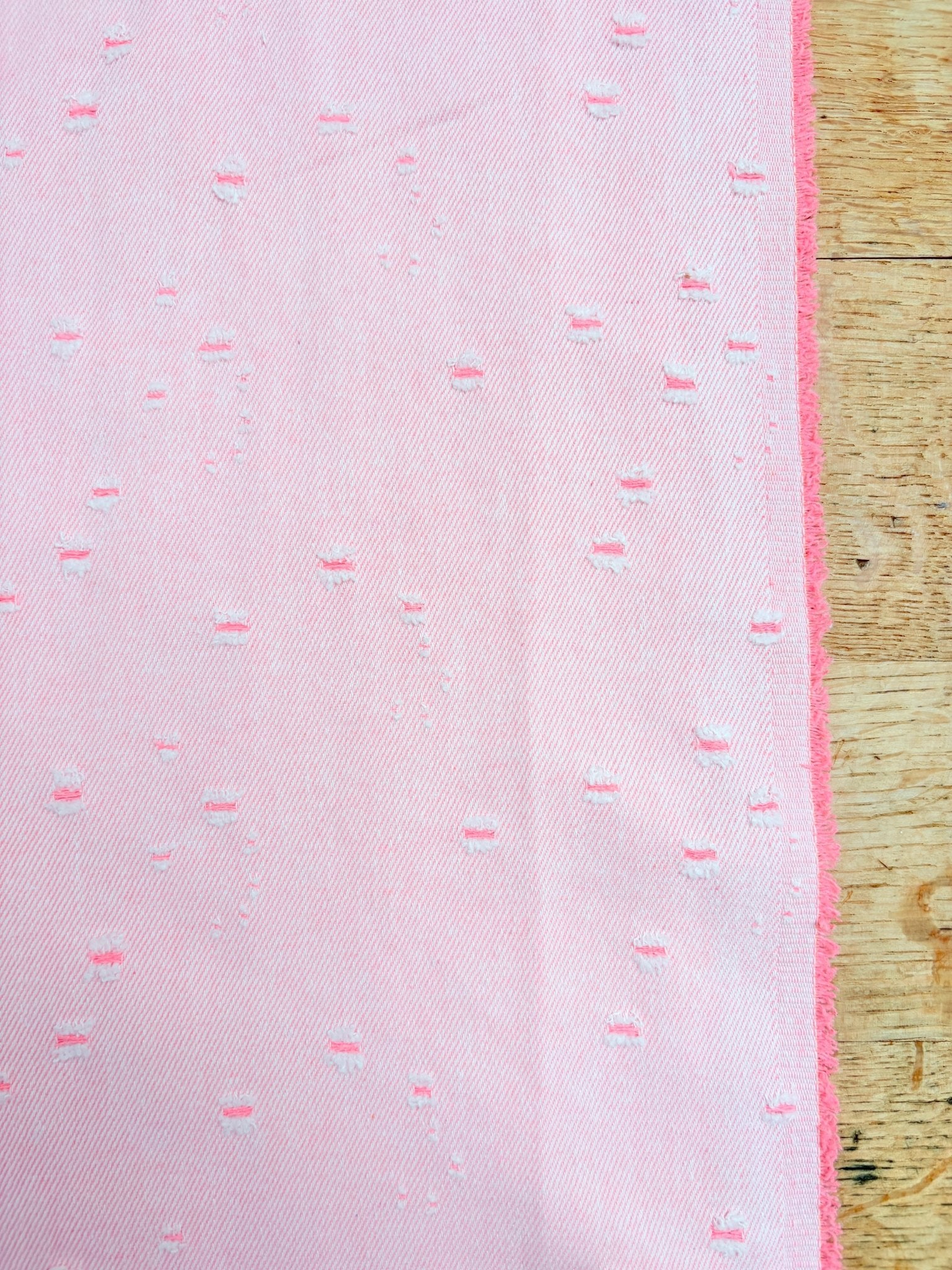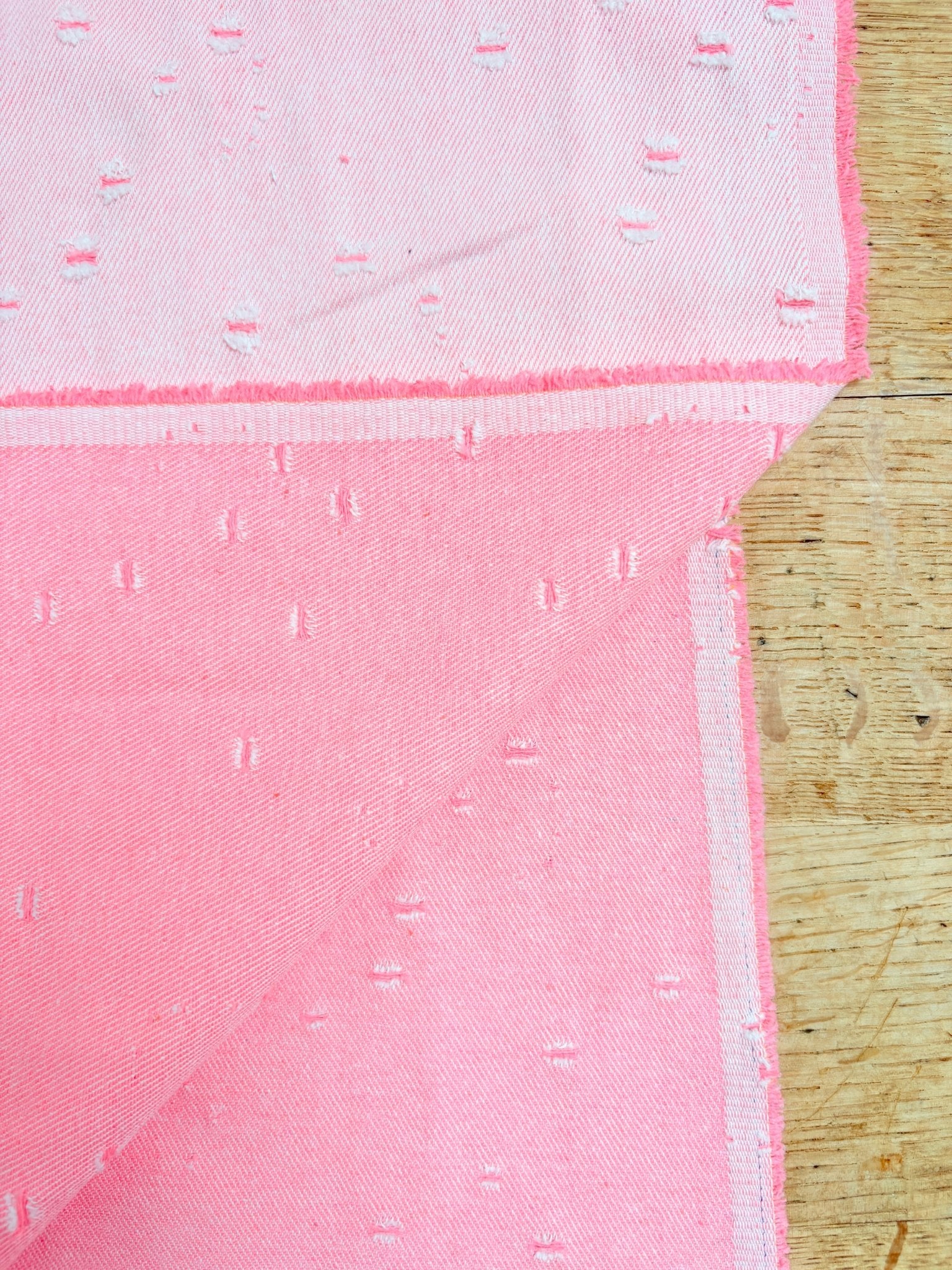 This is a midweight denim with no stretch.  The right side has a white and colour twill, with the 'wrong' side being the darker tone - use both sides for a fantastic mix and match outfit.  This is a distressed denim - and is a perfect match for our non-distressed pastel denim.
