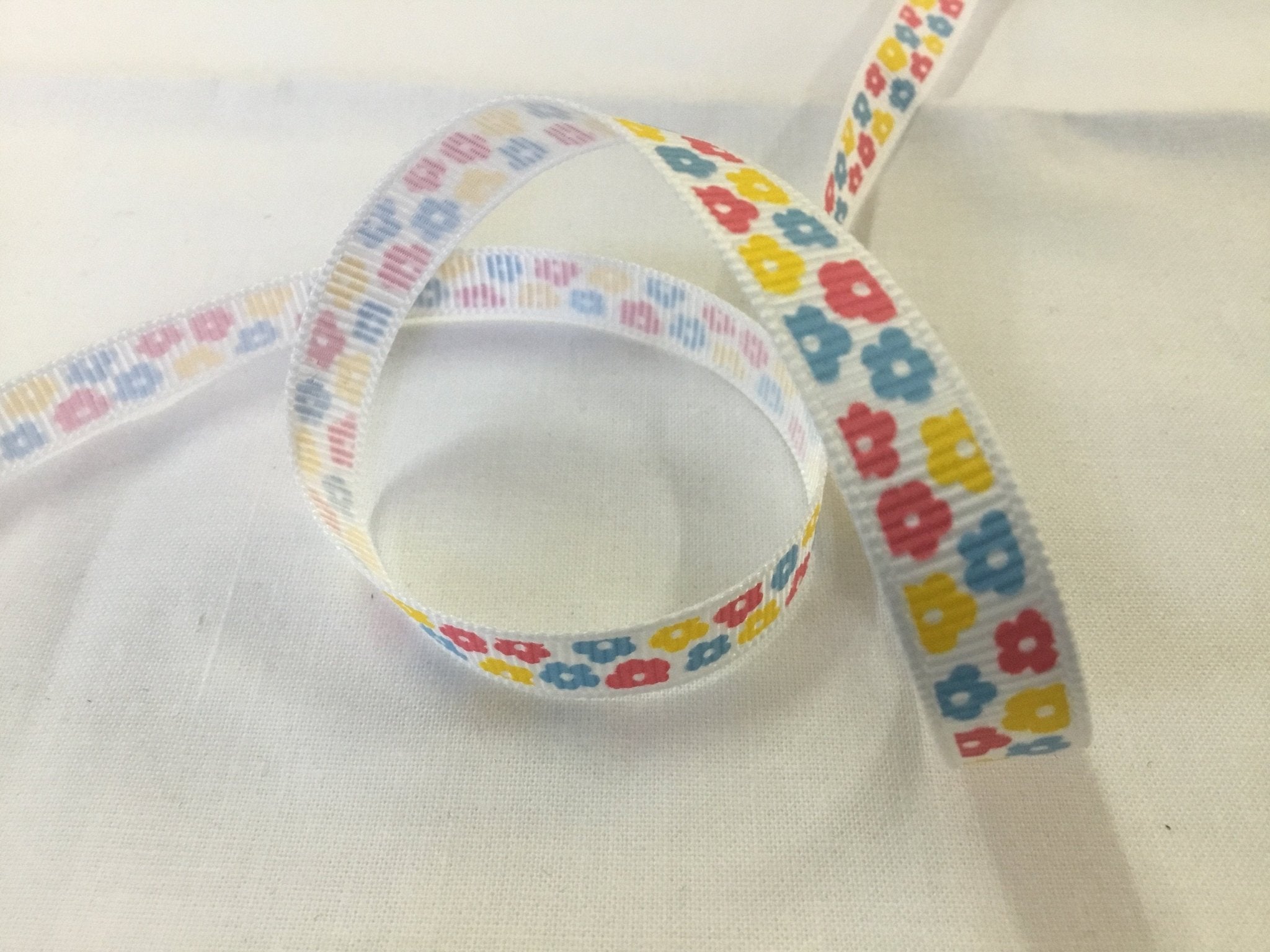 Colourful floral ribbon measuring 10mm wide. Sold by the metre, all multiples will be cut continuously in one piece.