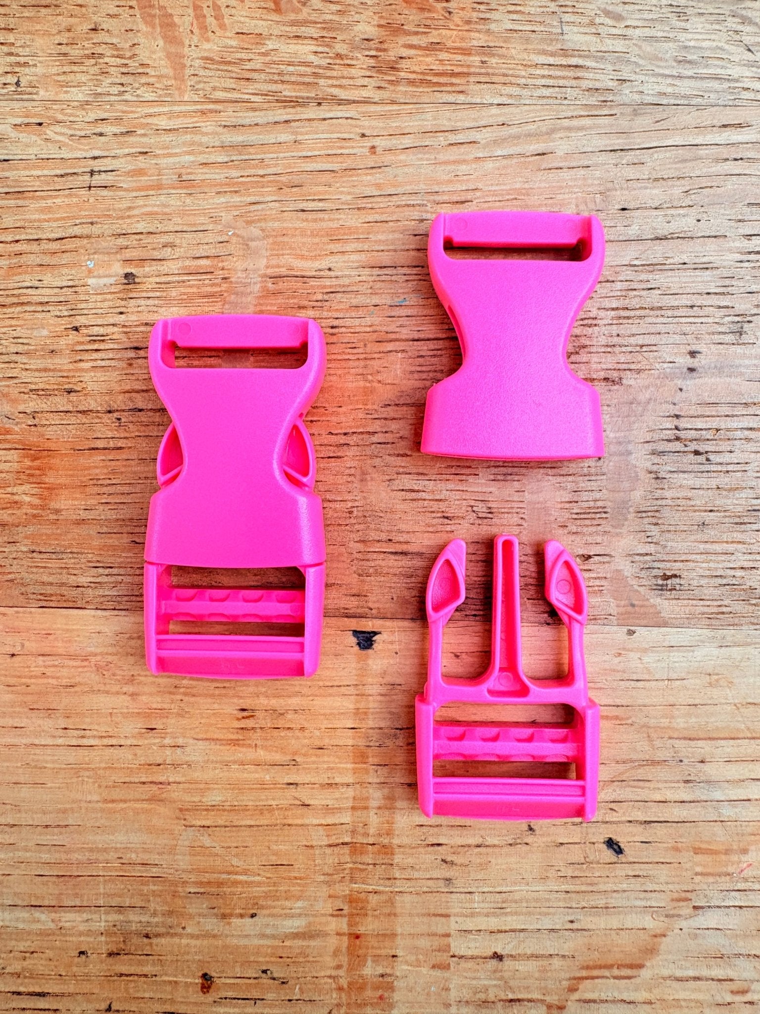 This type of buckle is used wherever an easy-opening webbing fastening is required, such as rucksack straps. Can be opened with one hand by squeezing tabs on each side of the buckle to release.