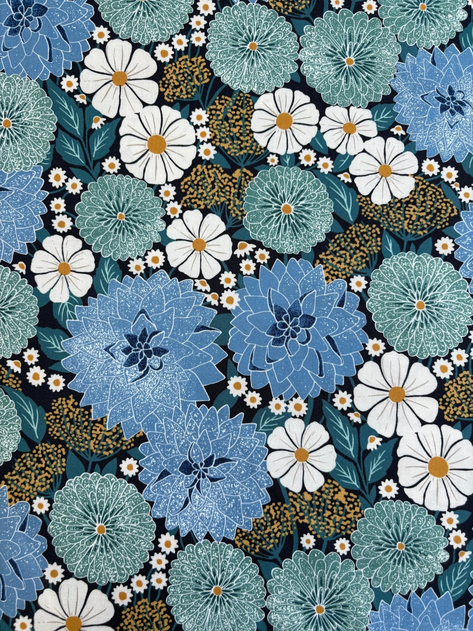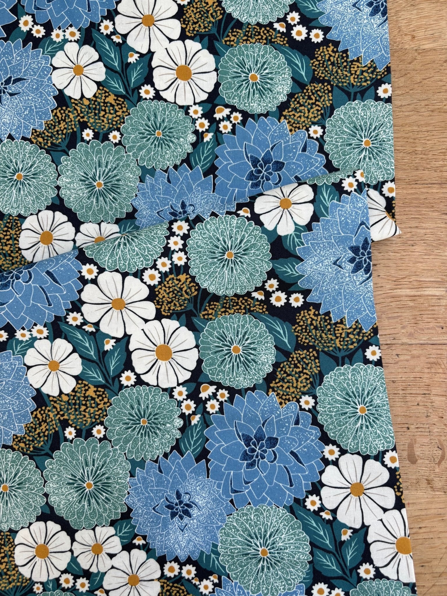 This fabric print by Katharine Watson features a bloom of flowers on a blue background.