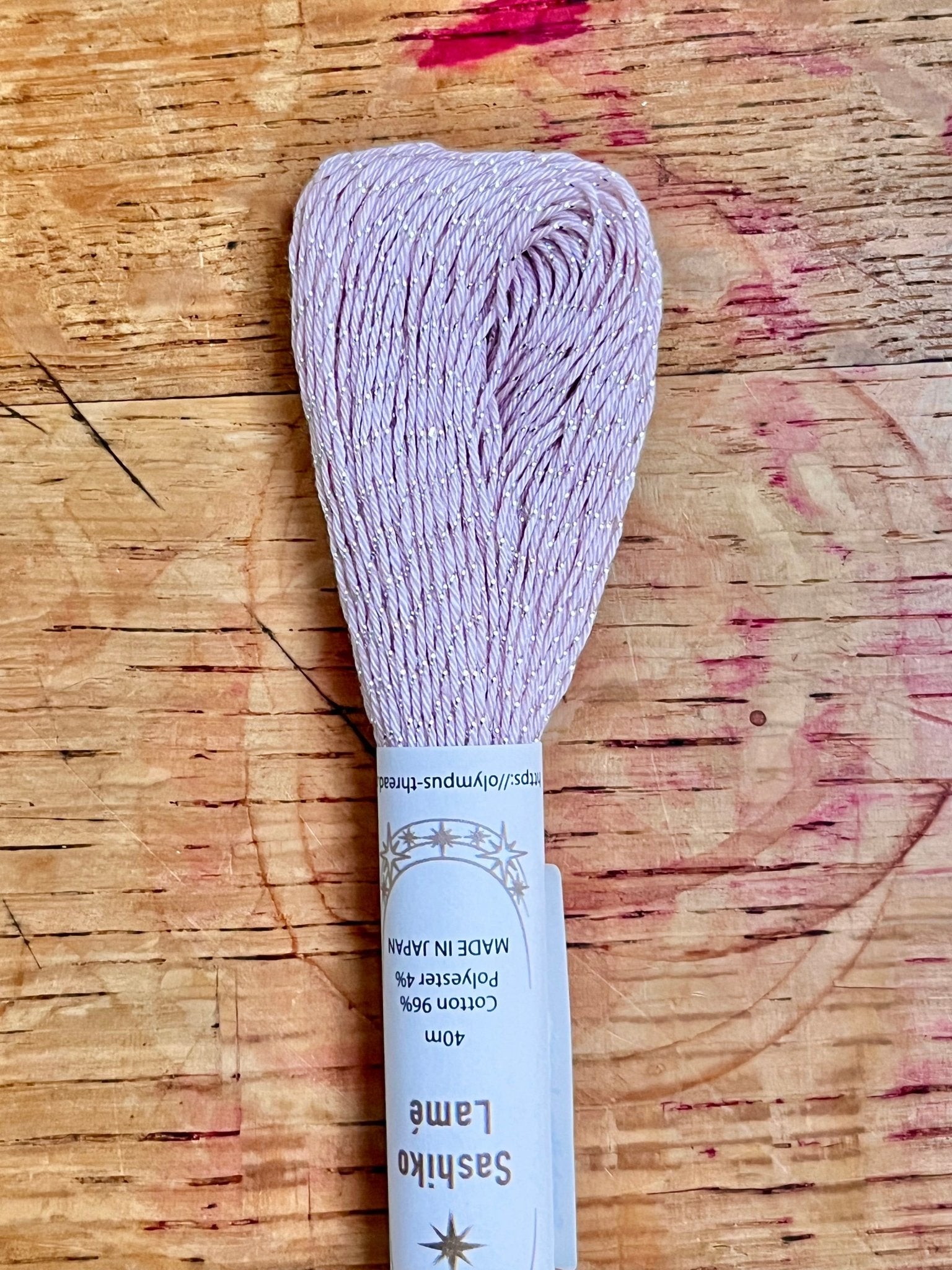96% cotton 4% polyester lame sashiko thread.  On a 40 metre skein.