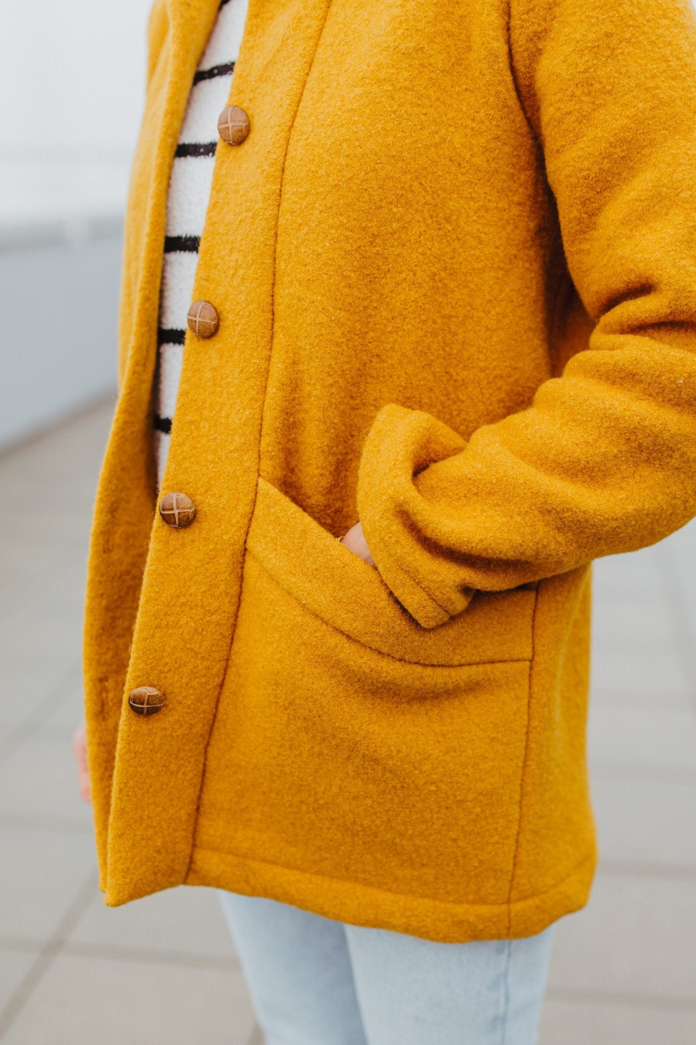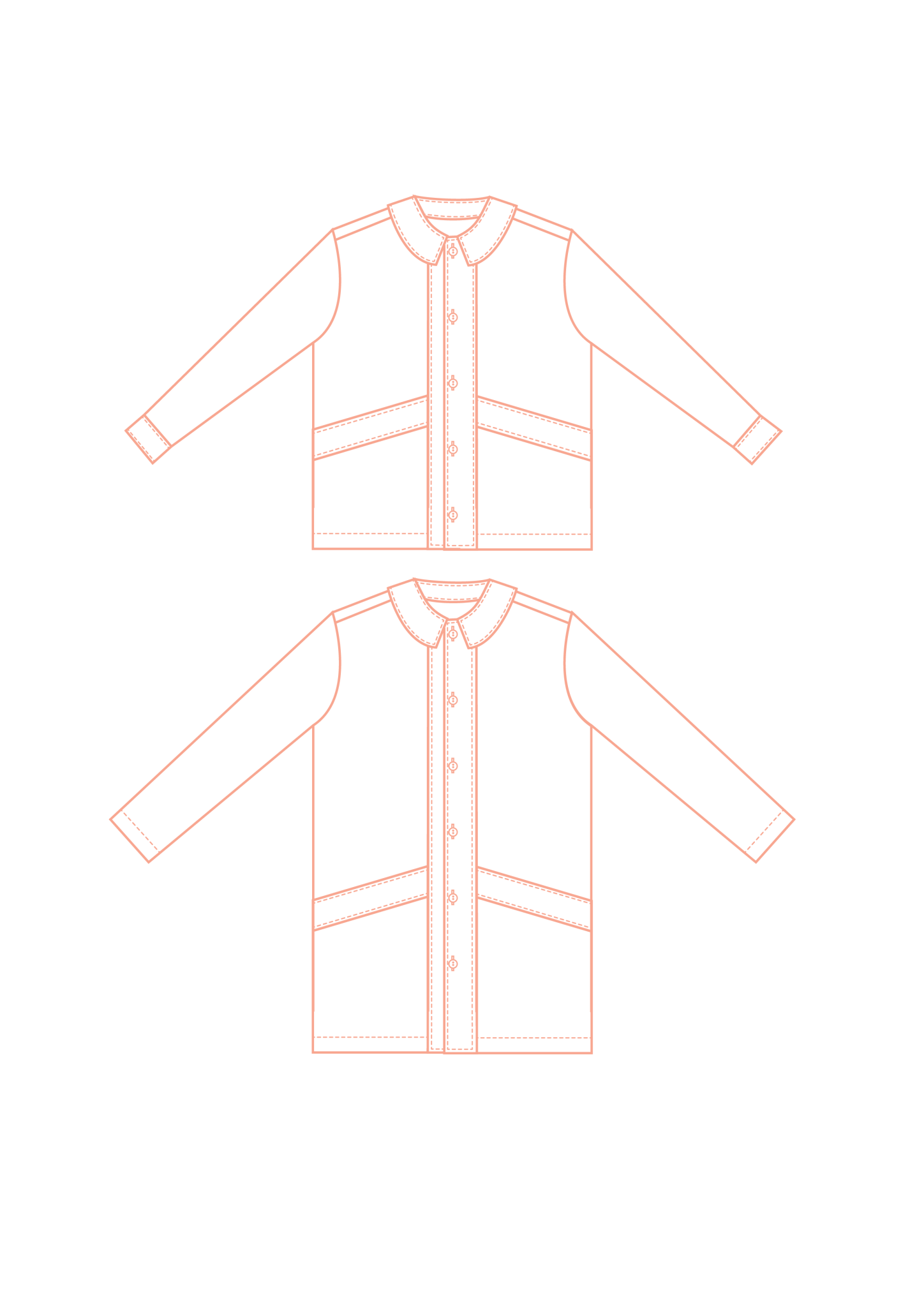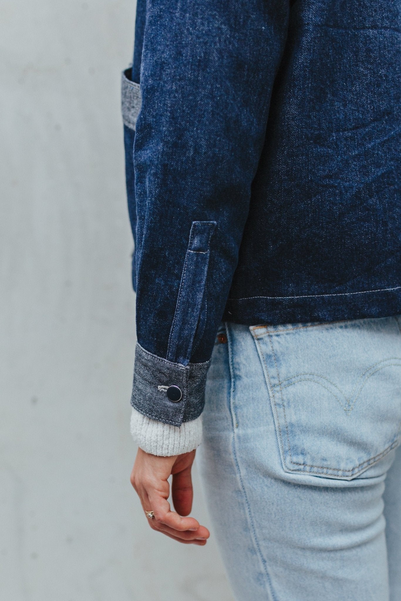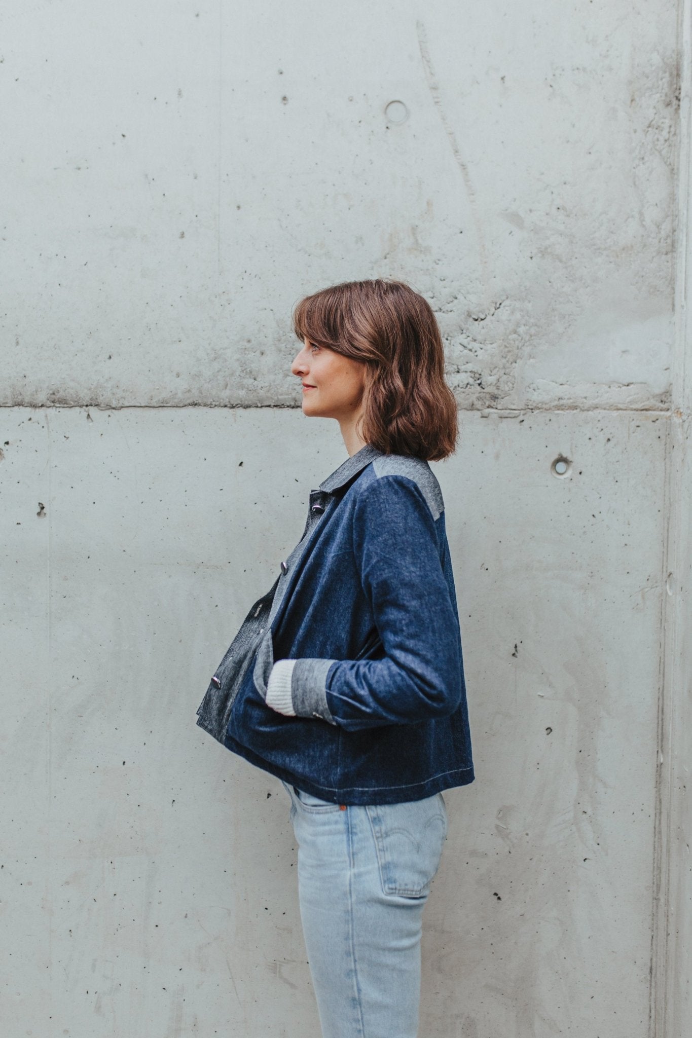 The Jameela Jacket is a cozy jacket pattern with two length options: Hip length or cropped. This jacket is a quick sew as it is unlined and has simple design lines. It features two big welt pockets at the front and a box pleat at the back. The cropped version comes with a sleeve placket and a sleeve cuff whilst the longer version features a simple sleeve hem.
