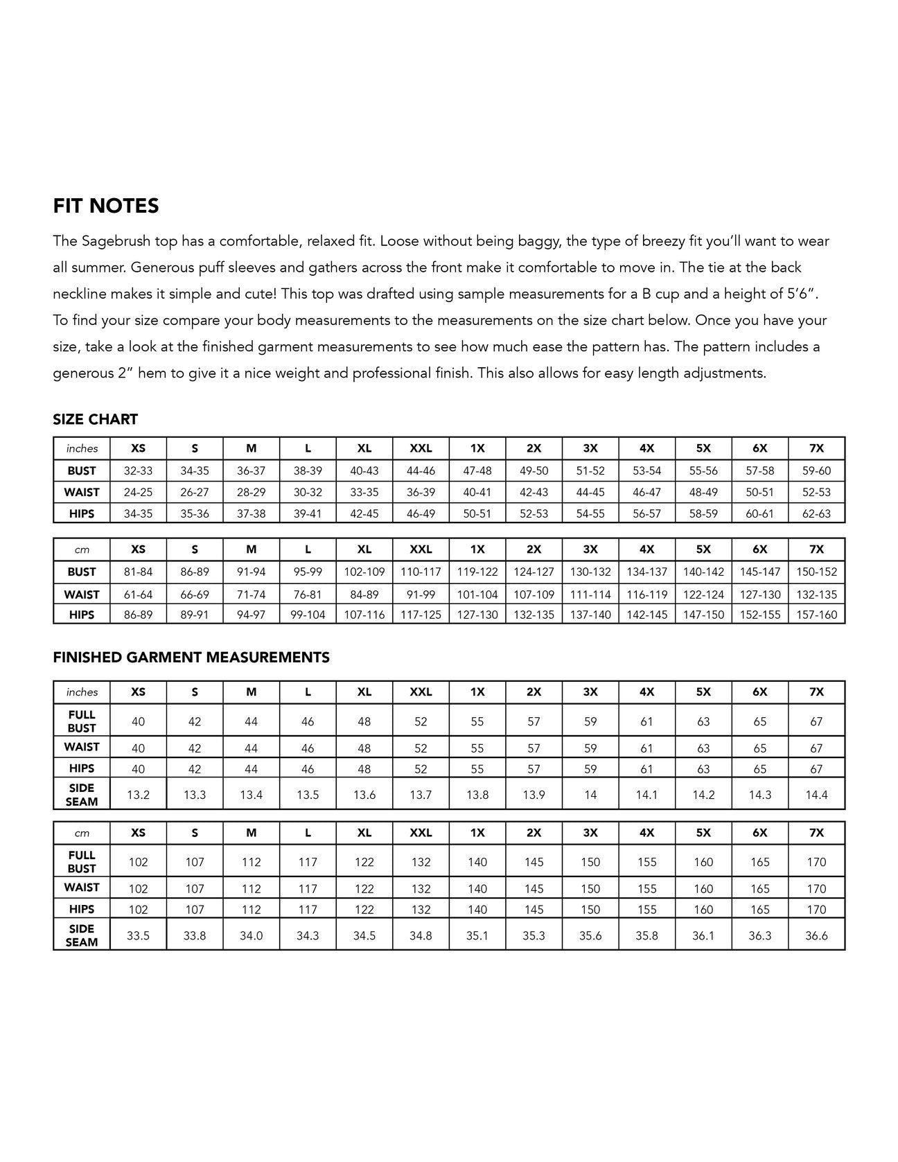 The Sagebrush Top is an elegant and easy-to-sew blouse that is a joy to make and wear. The Sagebrush is designed for woven fabrics and looks great in breezy fabrics like cotton voile, as well as more structured fabrics like a crisp linen. The simple design of the top lends itself well to customization. Loose without being baggy, the type of breezy fit you’ll want to wear all summer. Generous puff sleeves and gathers across the front make it comfortable to move in. The tie at the back neckline makes it simple and cute! The Sagebrush looks great tucked into something high waisted. This top was drafted using sample measurements for a B cup and a height of 5’6”.