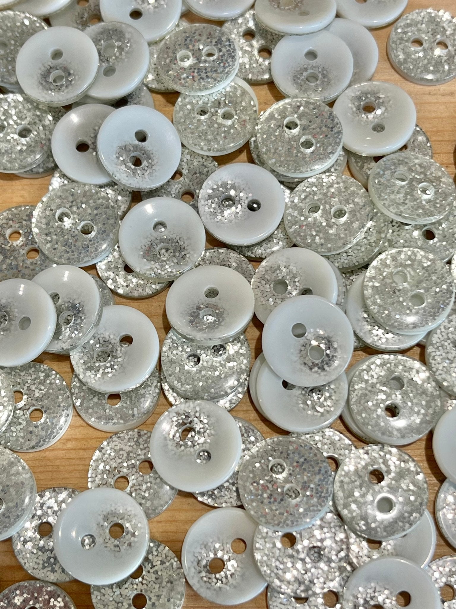 These sweet buttons are fully silver glitter on one side, with the other being pale grey with a glitter spot. Use them either way for maximum impact.