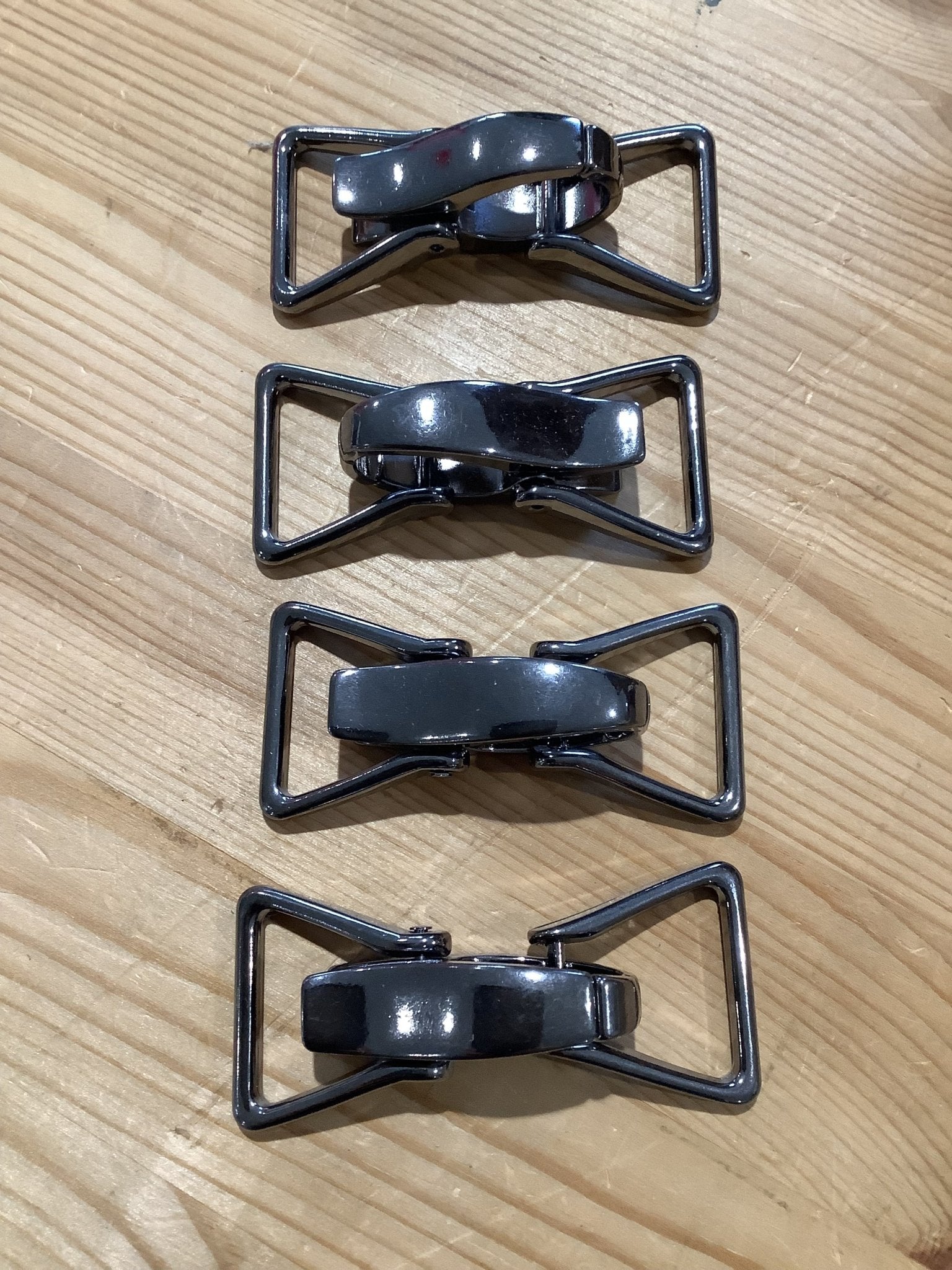 These clips are great for adjoining handles to your bags, or as a fastening on your clothing. They are 80mm in full length, with each trapezoidal ring measuring approx 25mm along the wider inner measurement - so would fit a 25mm webbing or tape.