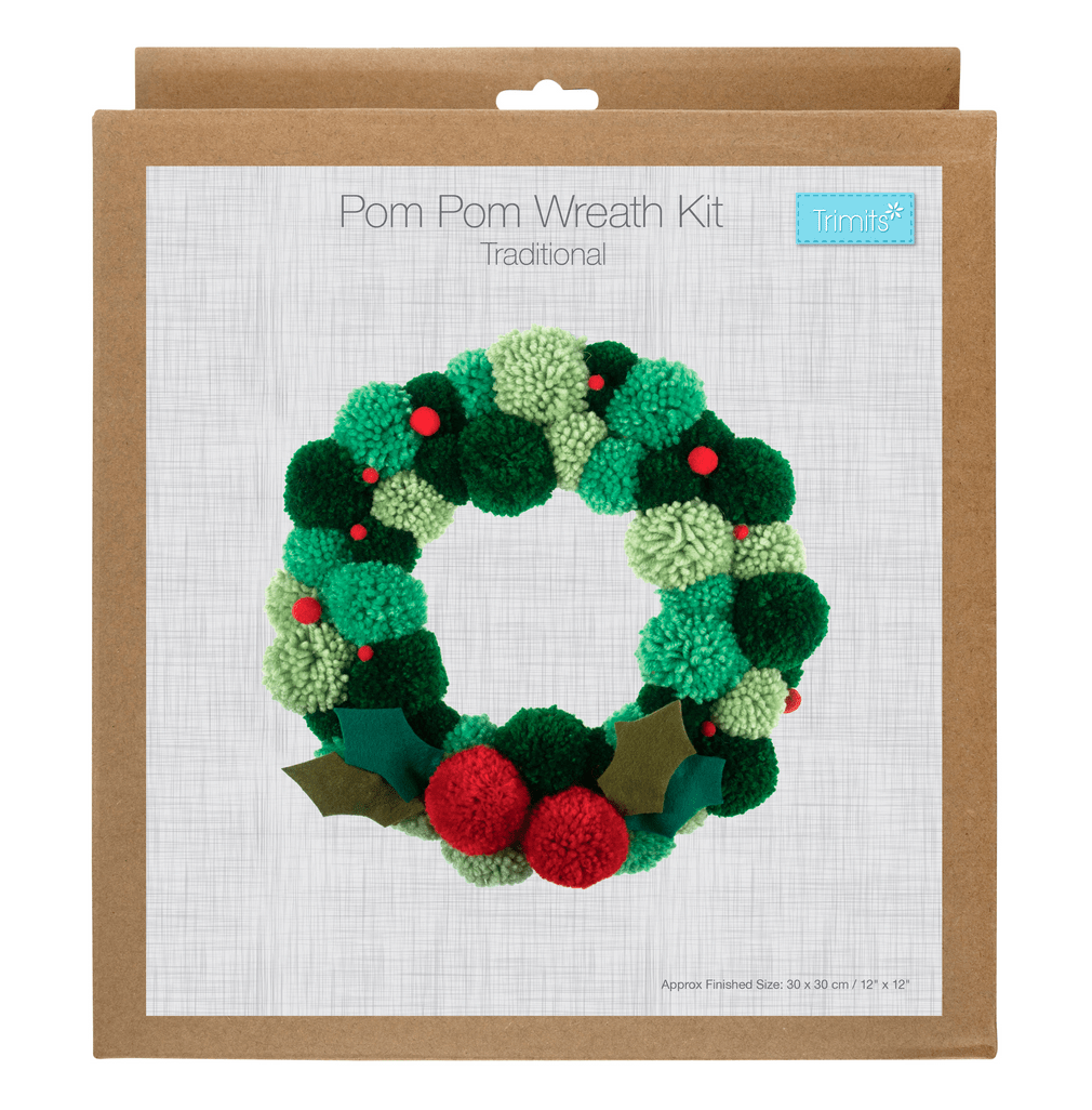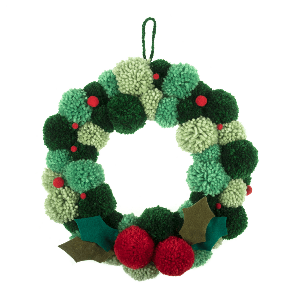 Festive pom pom wreath. Kit includes: two pom pom makers - 5.5cm and 7cm sizes; acrylic yarns, metal hoop (10 inch) and instructions.