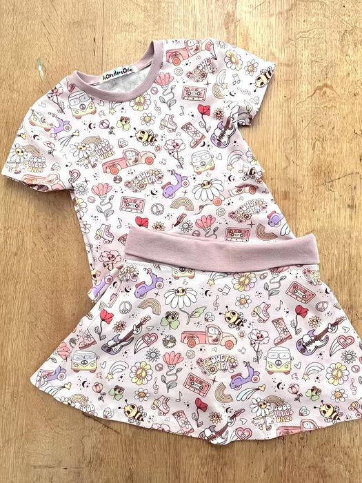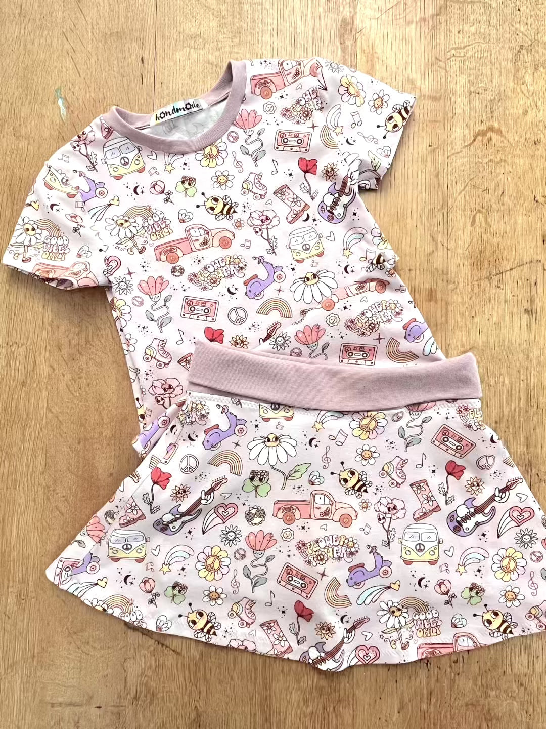 The most practical of children's patterns: make shorts, a flippy skirt, or combine them for a handstand approved skort. A wide yoga style waistband makes this a super comfortable item of clothing. Paired with a super practical basic tee for a full outfit.