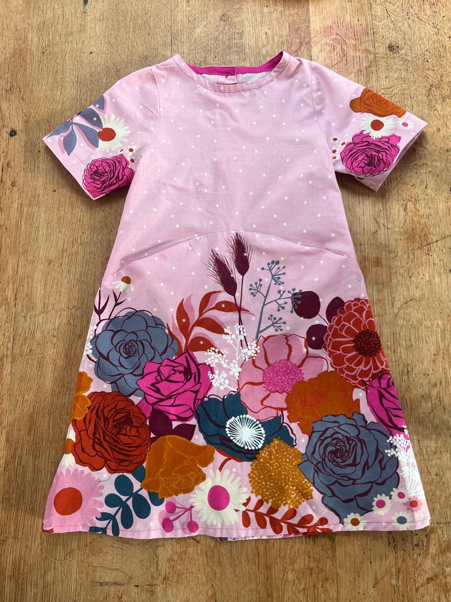 The Zoe Dress pattern (which goes up to age 9!), beautiful Ruby Star fabric, co-ordinating binding, thread, and pretty pink buttons.