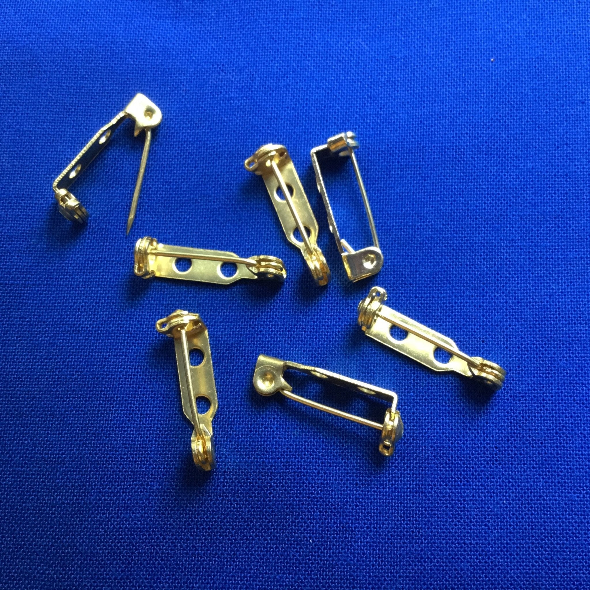 Traditional gold metal brooch backs, with pin and safety fastening. Can be glued on or sewed on through the holes.