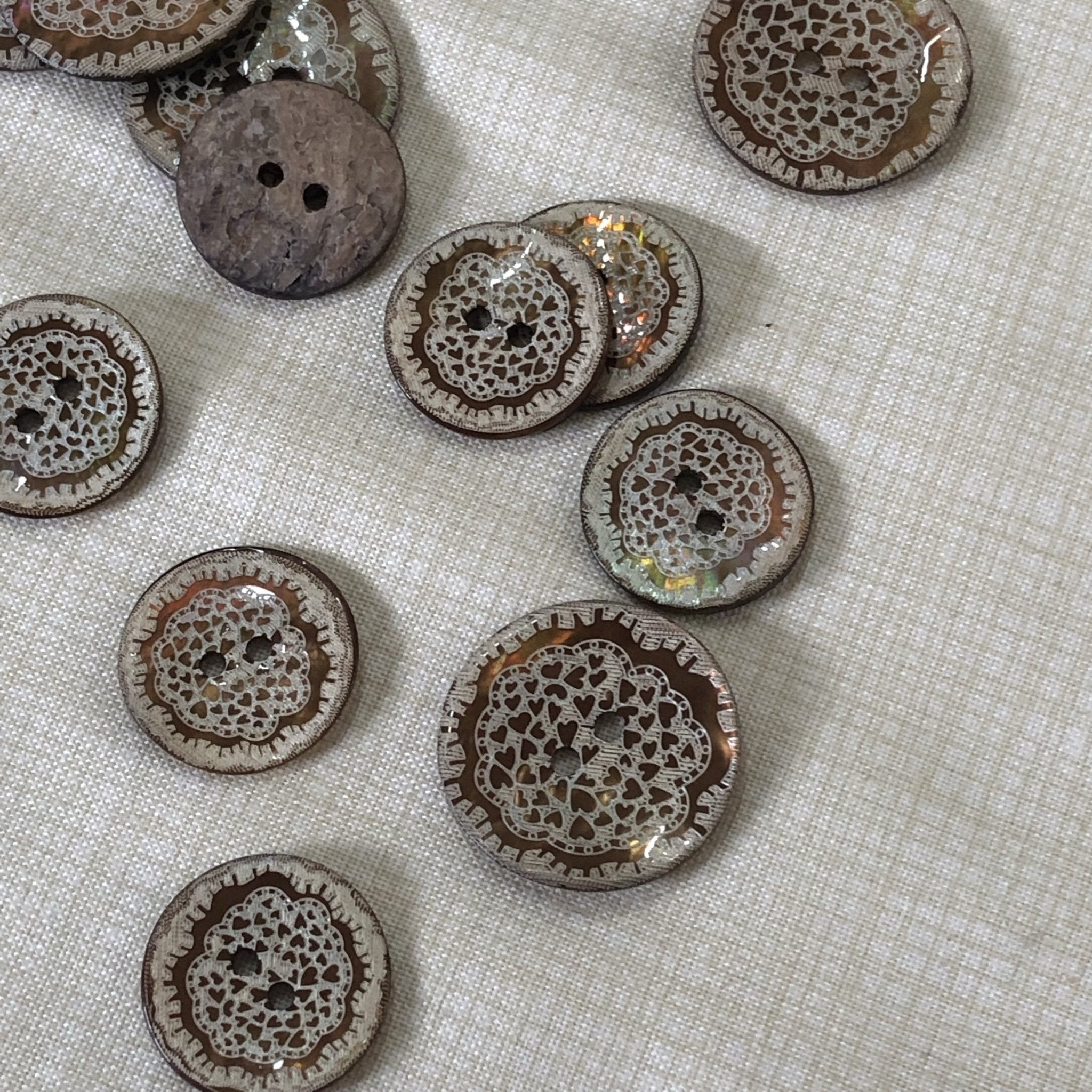 Brown shell button with heart etched design in the centre. Available in 2 sizes. The price is per button.