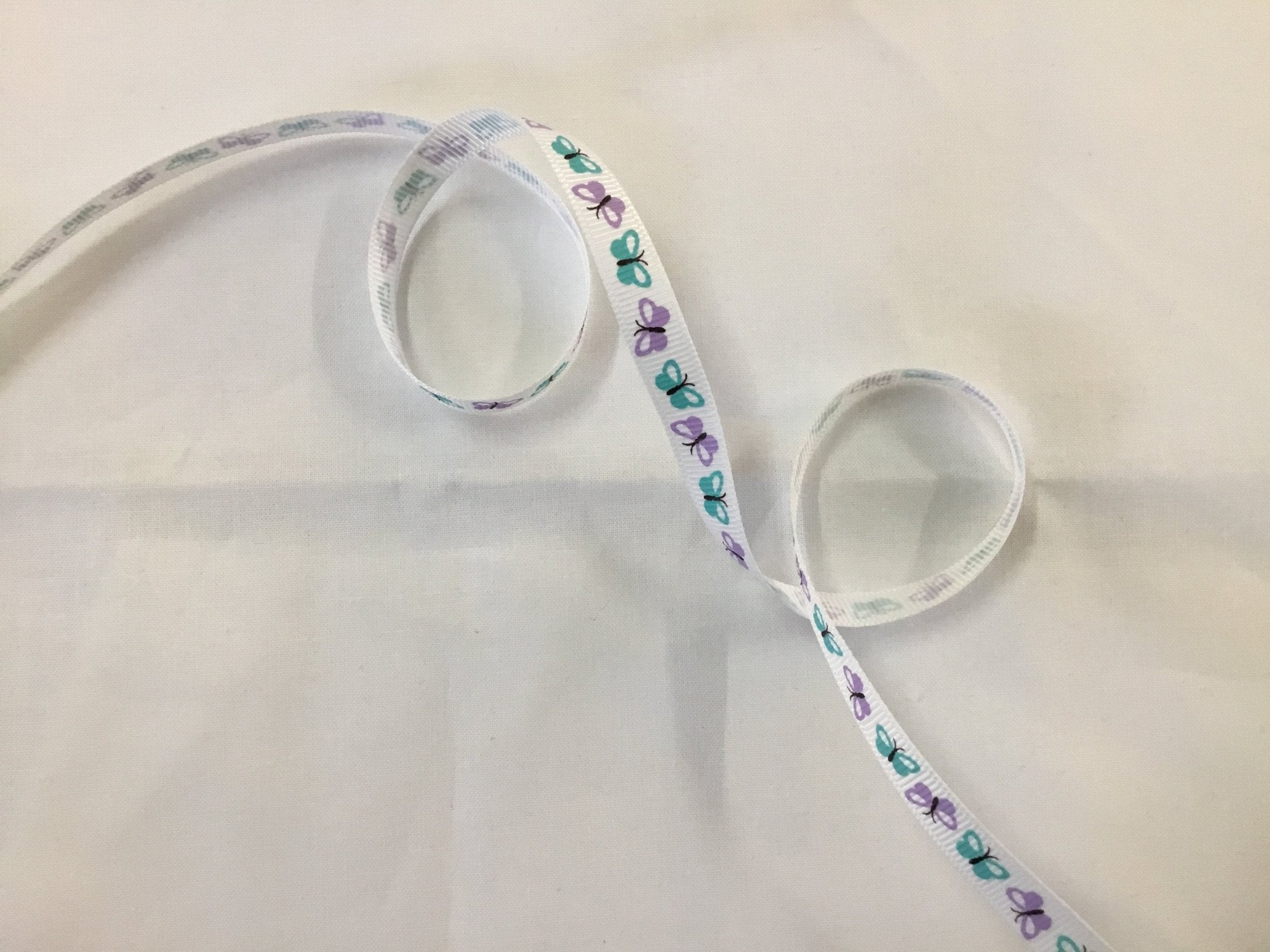 Colourful butterfly ribbon with a width of 10mm. Sold by the meter, all units will be cut continuously.