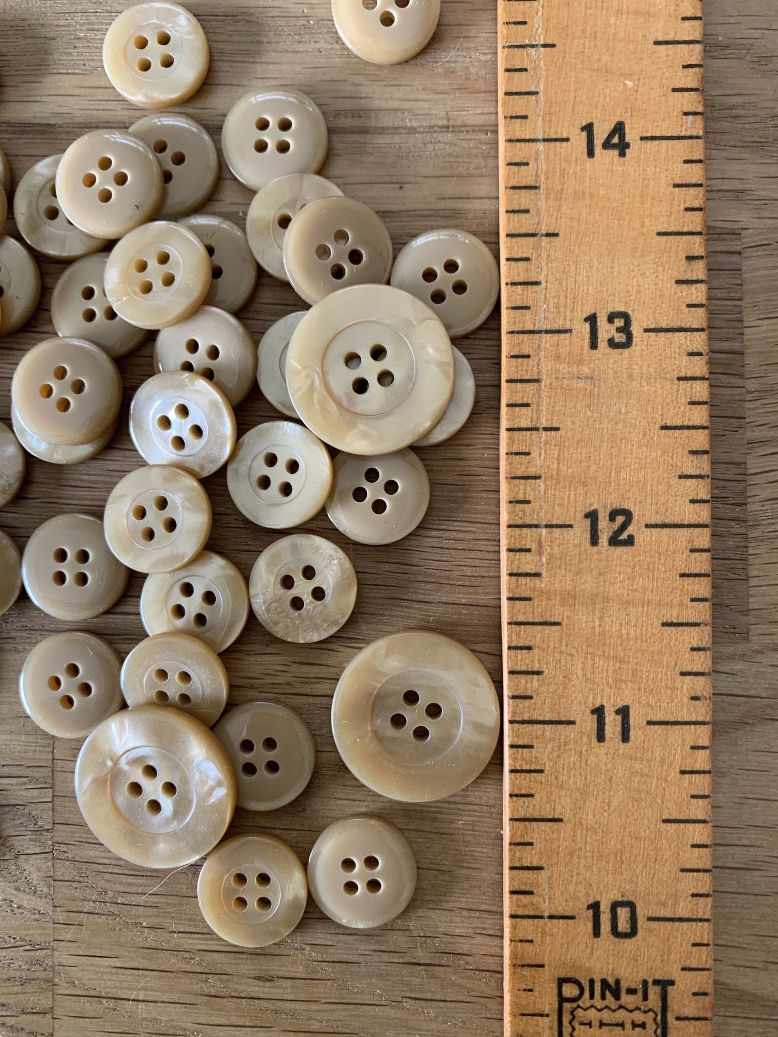 Taupe 4 hole Ring Edge Pearly Button - 15mm is backordered and will ship as soon as it is back in stock.