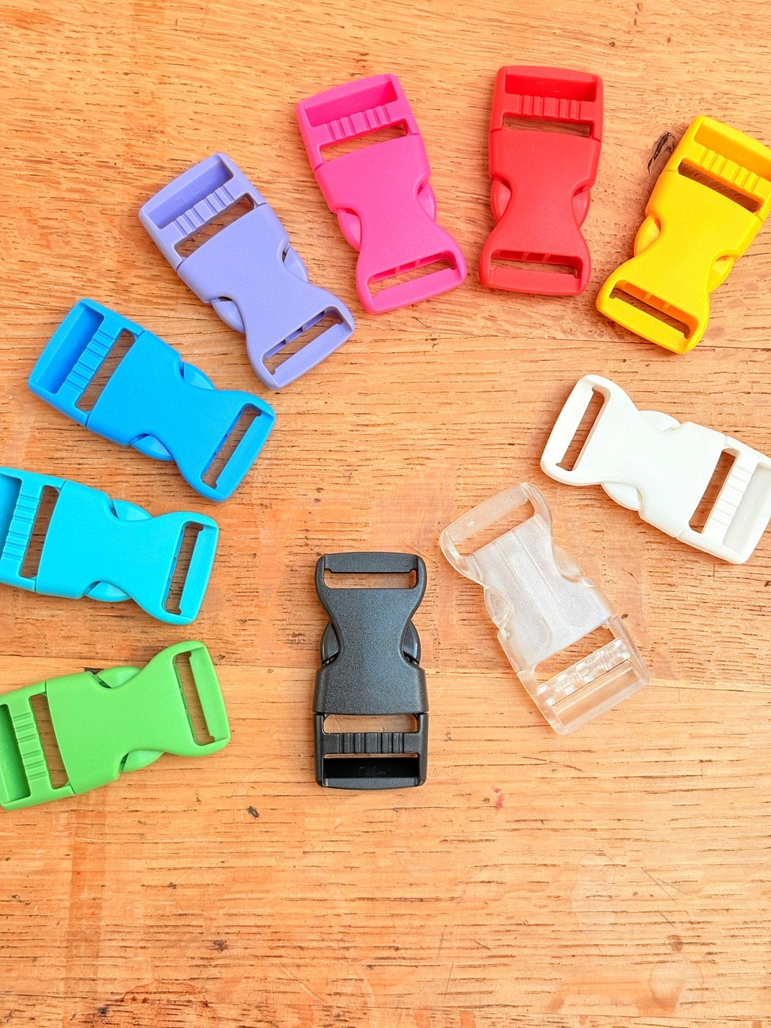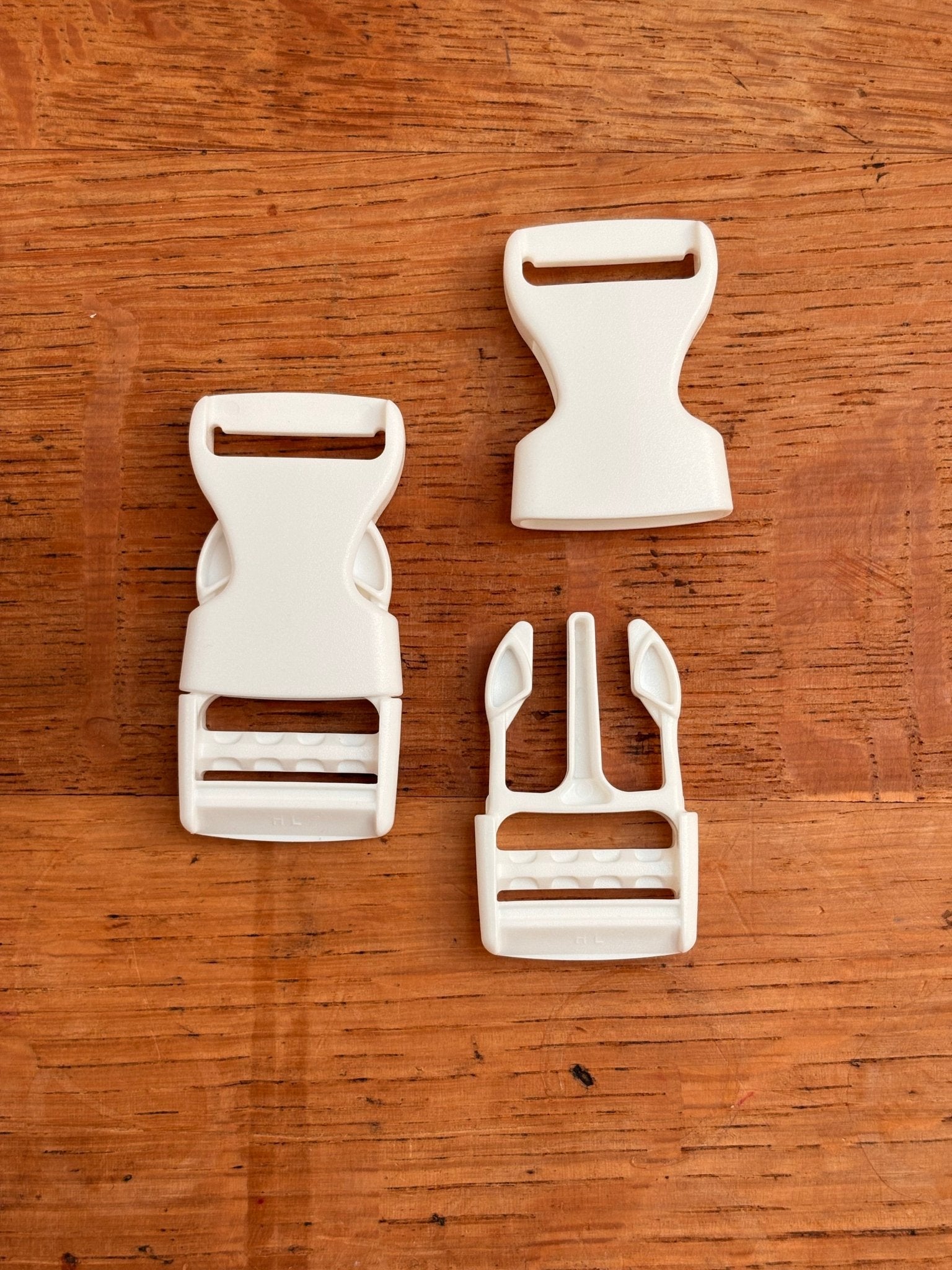 This type of buckle is used wherever an easy-opening webbing fastening is required, such as rucksack straps. Can be opened with one hand by squeezing tabs on each side of the buckle to release.