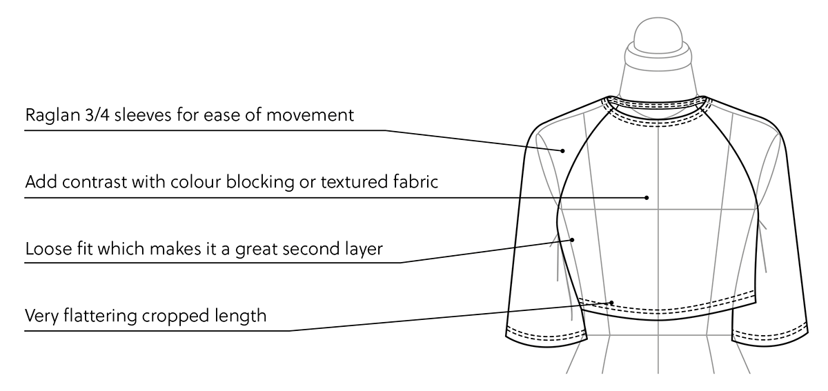 Nivis is a comfortable raglan crop top designed for stretch fabrics.