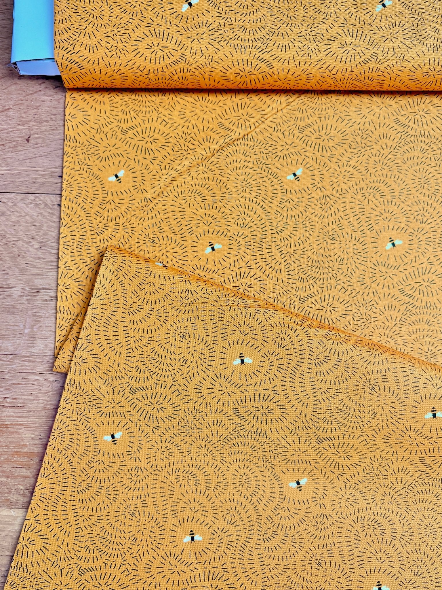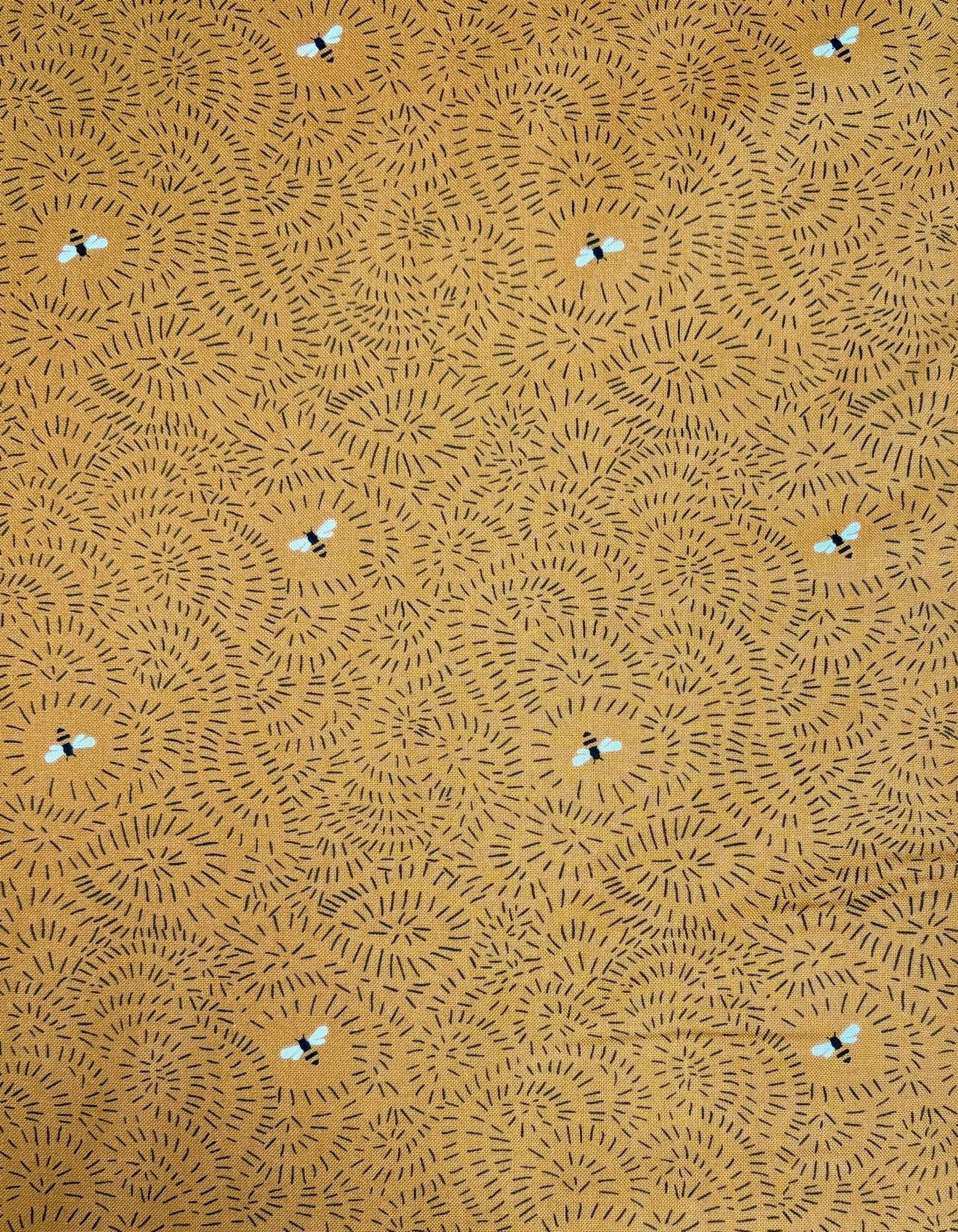 This fabric print by Gingiber features bees on a mustard background in her unique style.