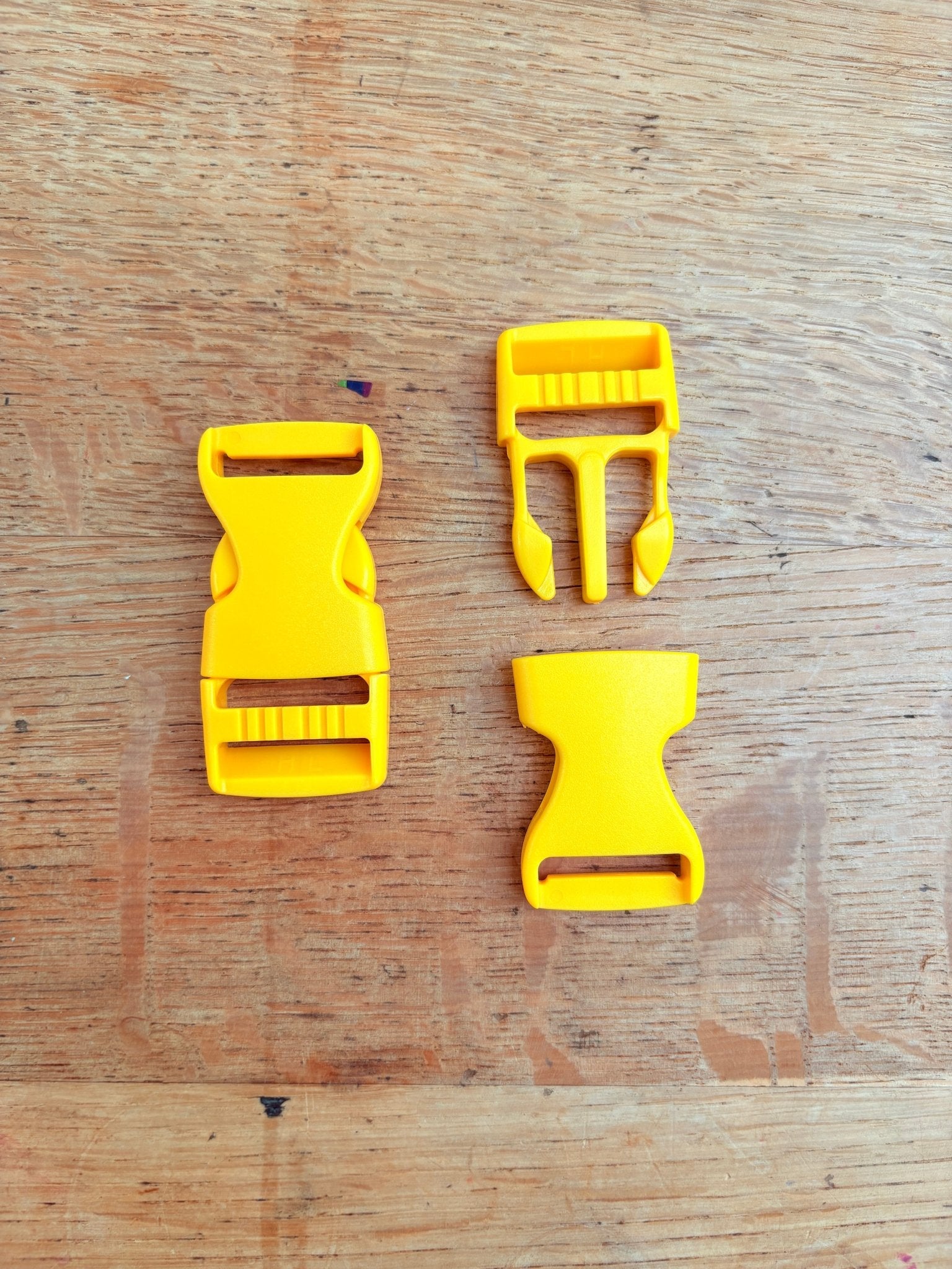 This type of buckle is used wherever an easy-opening webbing fastening is required, such as rucksack straps. Can be opened with one hand by squeezing tabs on each side of the buckle to release.