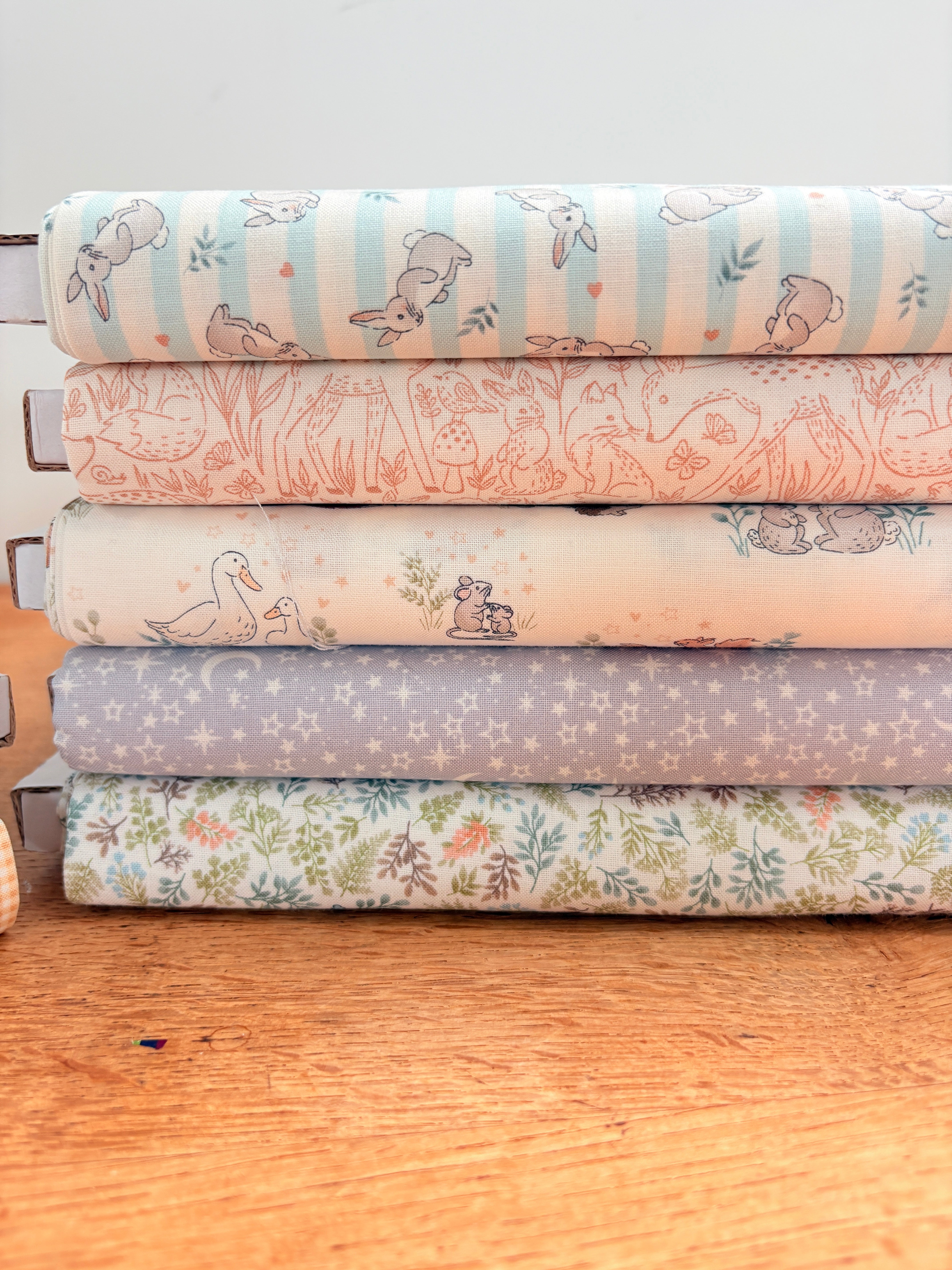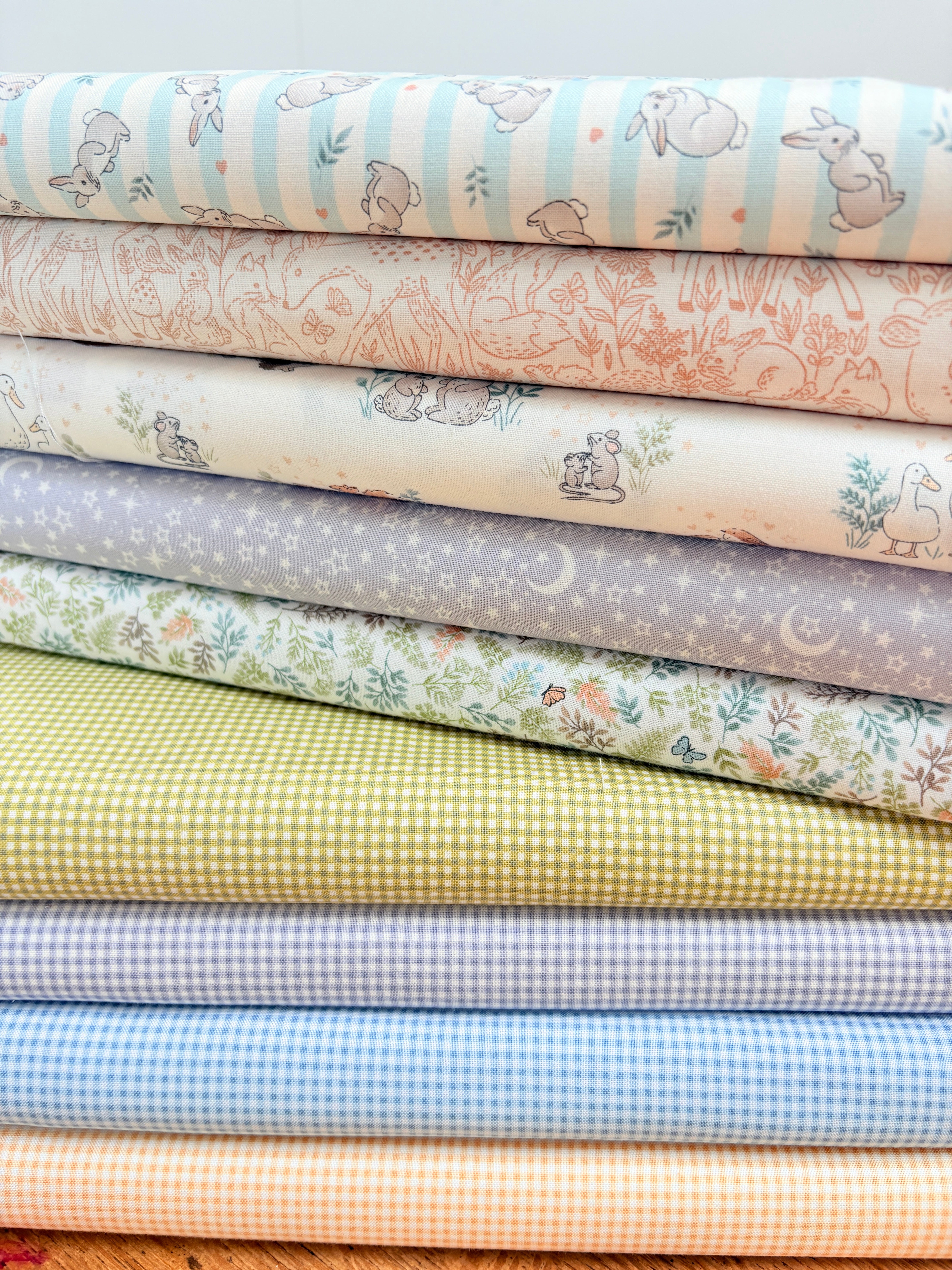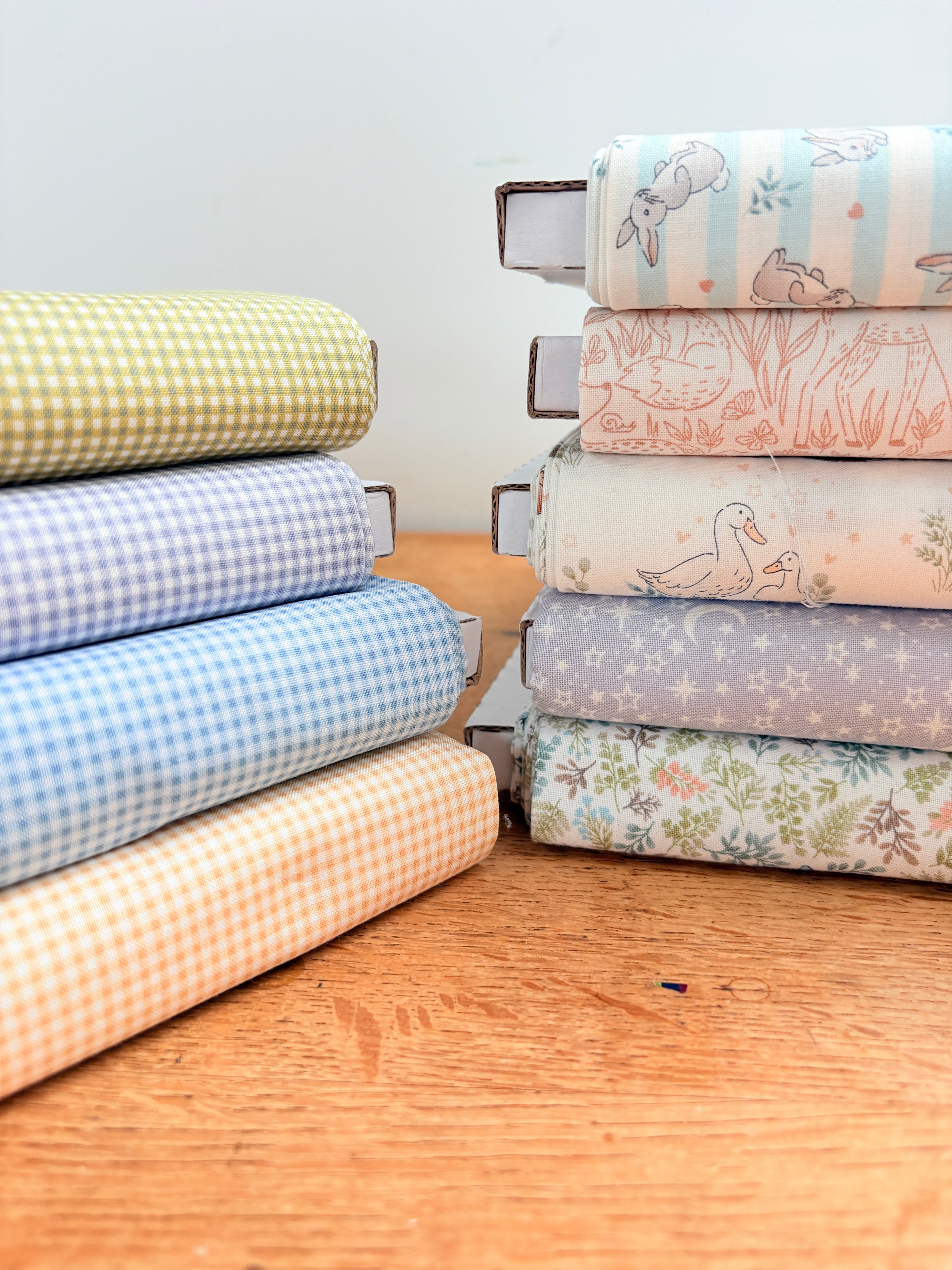 This is a 9 fat quarter bundle of the Little Ones collection by Makower, 5 cute prints, and 4 matching tonal mini ginghams. Each quarter measures approximately 50cm x 55cm.